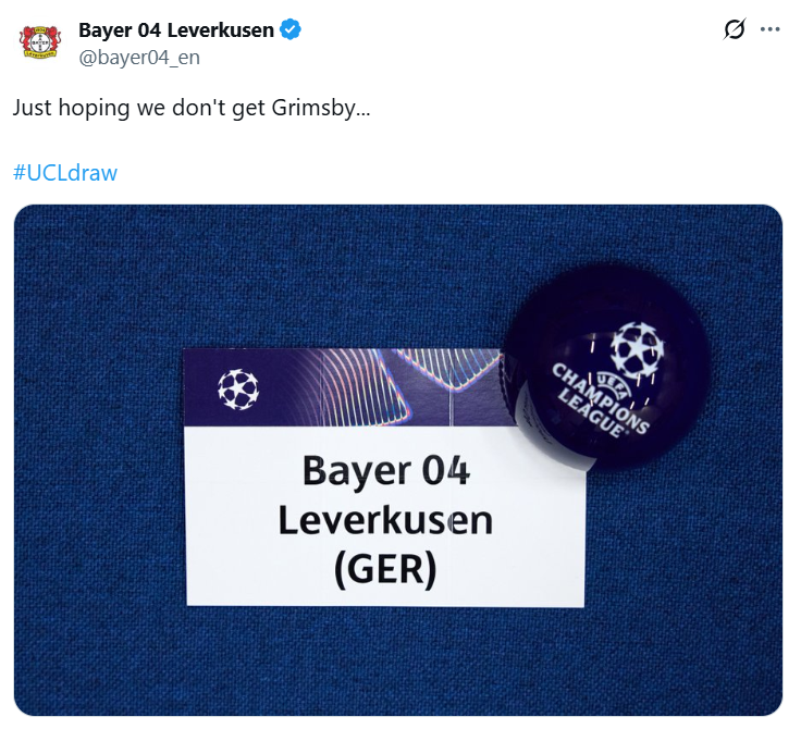 Ahead of the 2025-2026 Champions League draw in Monaco on 28/8, Leverkusen's X account posted the message, "Just hoping not to draw Grimsby".