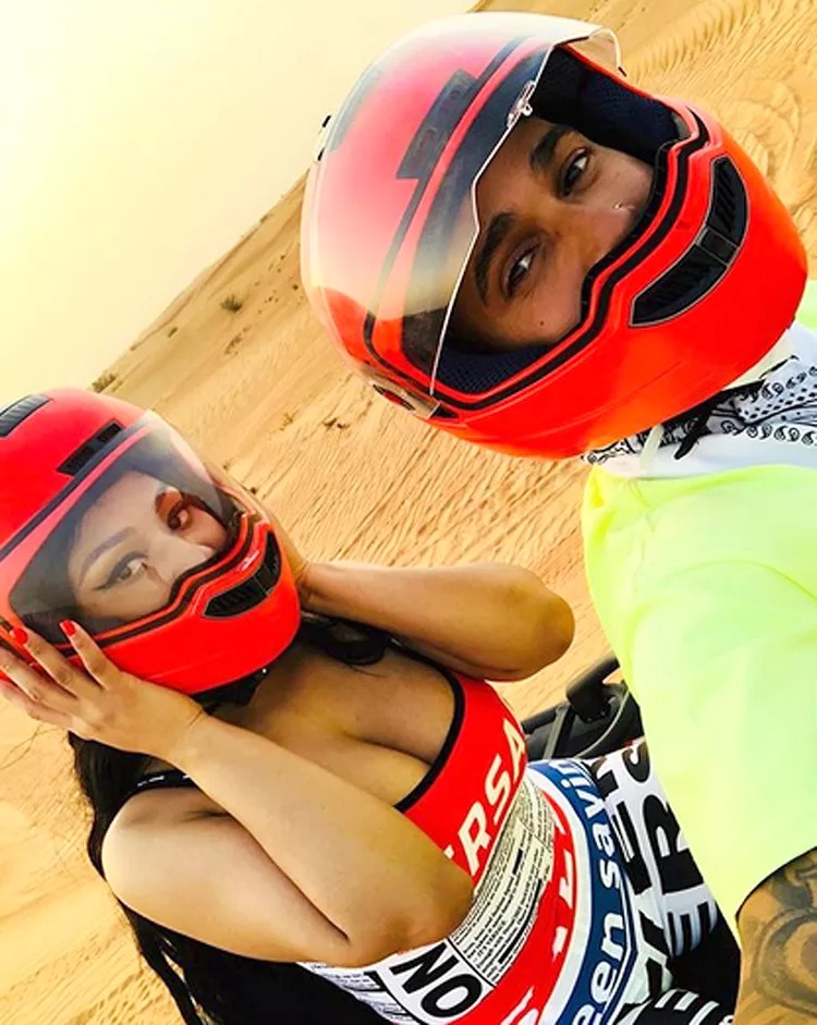 Singer Nicki Minaj was rumored to be involved with Hamilton, after the rapper posted photos of them in the Dubai desert in 9/2018. A week prior, they had also been seen together at a New York Fashion Week event. |