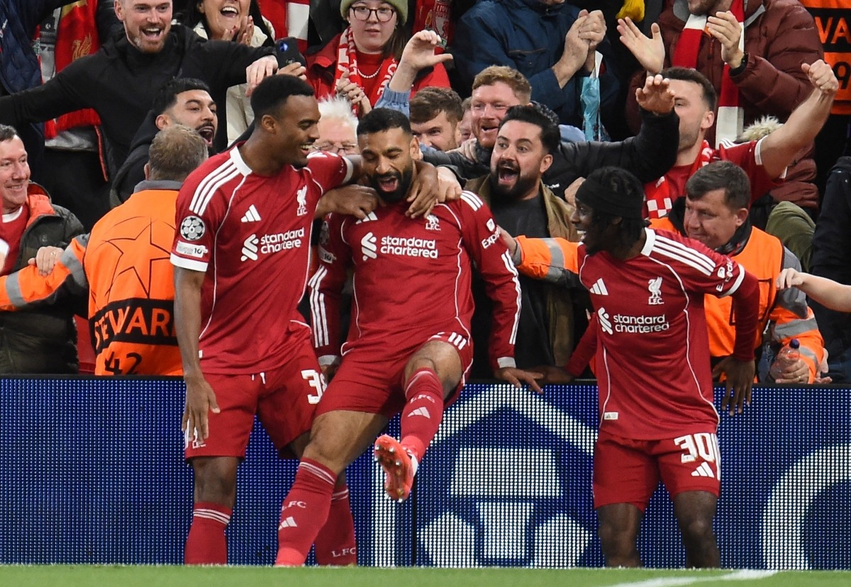 Salah (center) celebrates with teammates after scoring Liverpool's second goal against Atletico. *Reuters* |