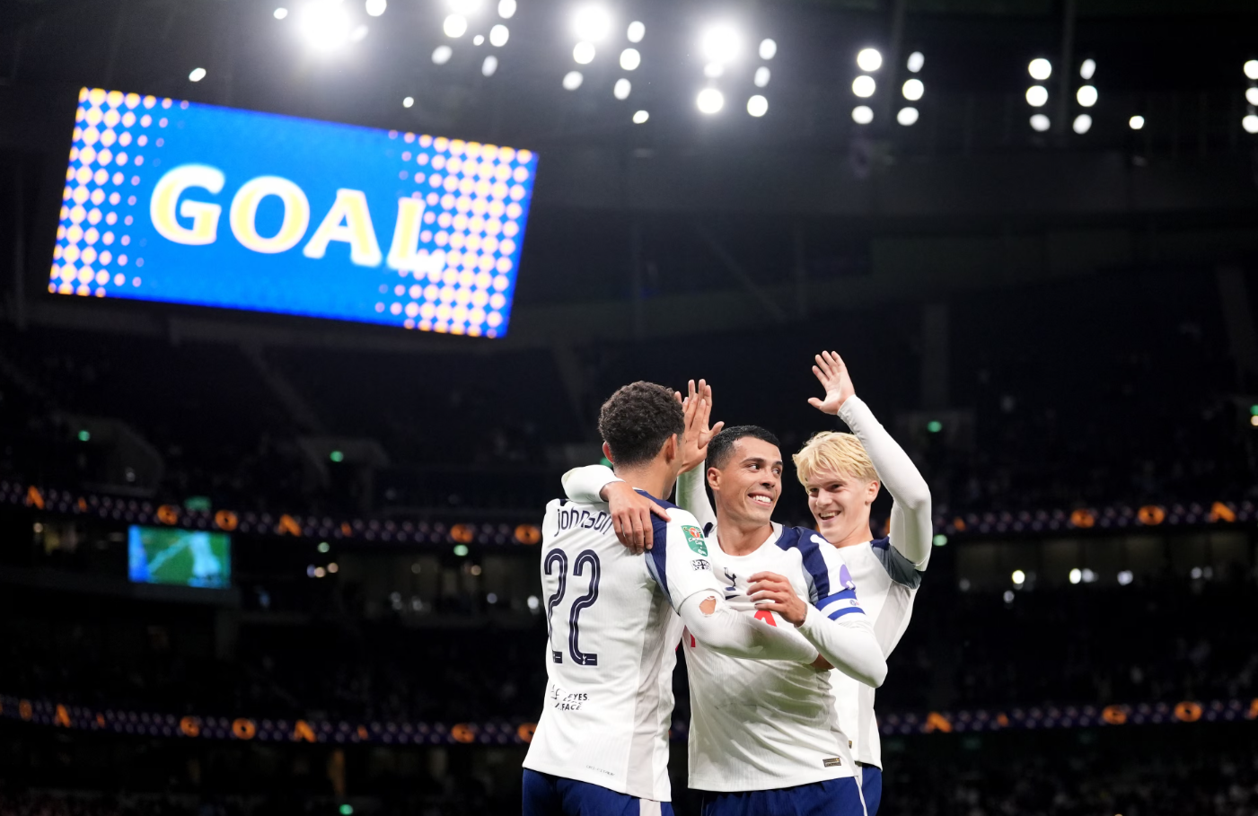 Tottenham celebrate Brennan Johnson's goal that sealed a 3-0 win over Doncaster Rovers in the third round of the League Cup. Photo: PA
