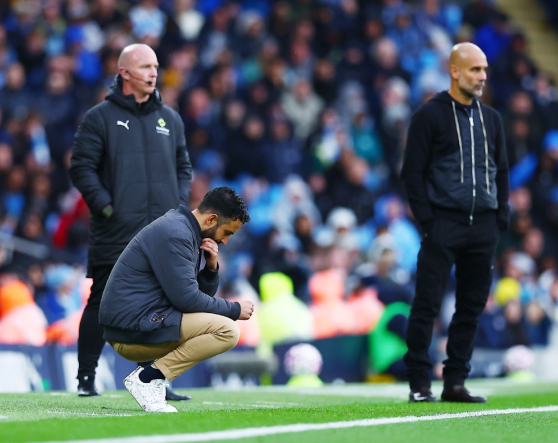 Ruben Amorim squats in disappointment during Man Utd's loss to Man City on 14/9. *Photo: Shutterstock* |