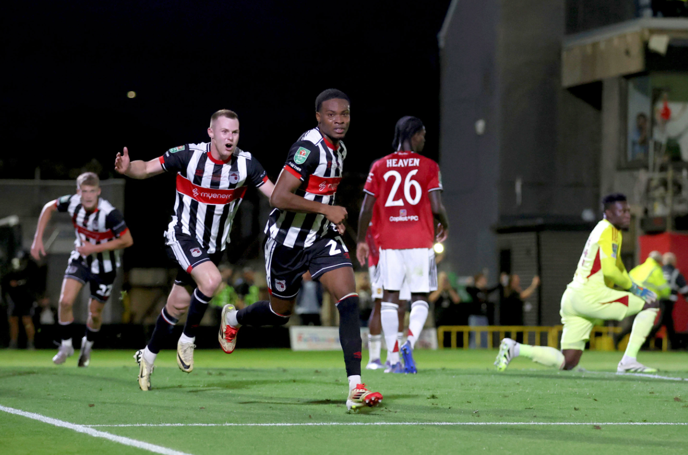 Tyrell Warren celebrates his goal during Grimsby Town's League Cup second-round victory over Man Utd at Blundell Park, Cleethorpes, Lincolnshire, UK on the evening of 27/8/2025. _Photo: AP_ |