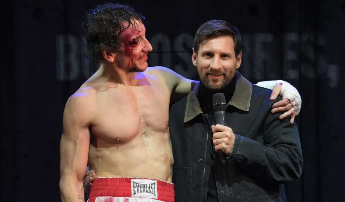 Lionel Messi (right) speaks alongside actor Nicolas Vazquez on stage at the Lola Membrives theater in Buenos Aires on 2/9. Photo: Reproducao |