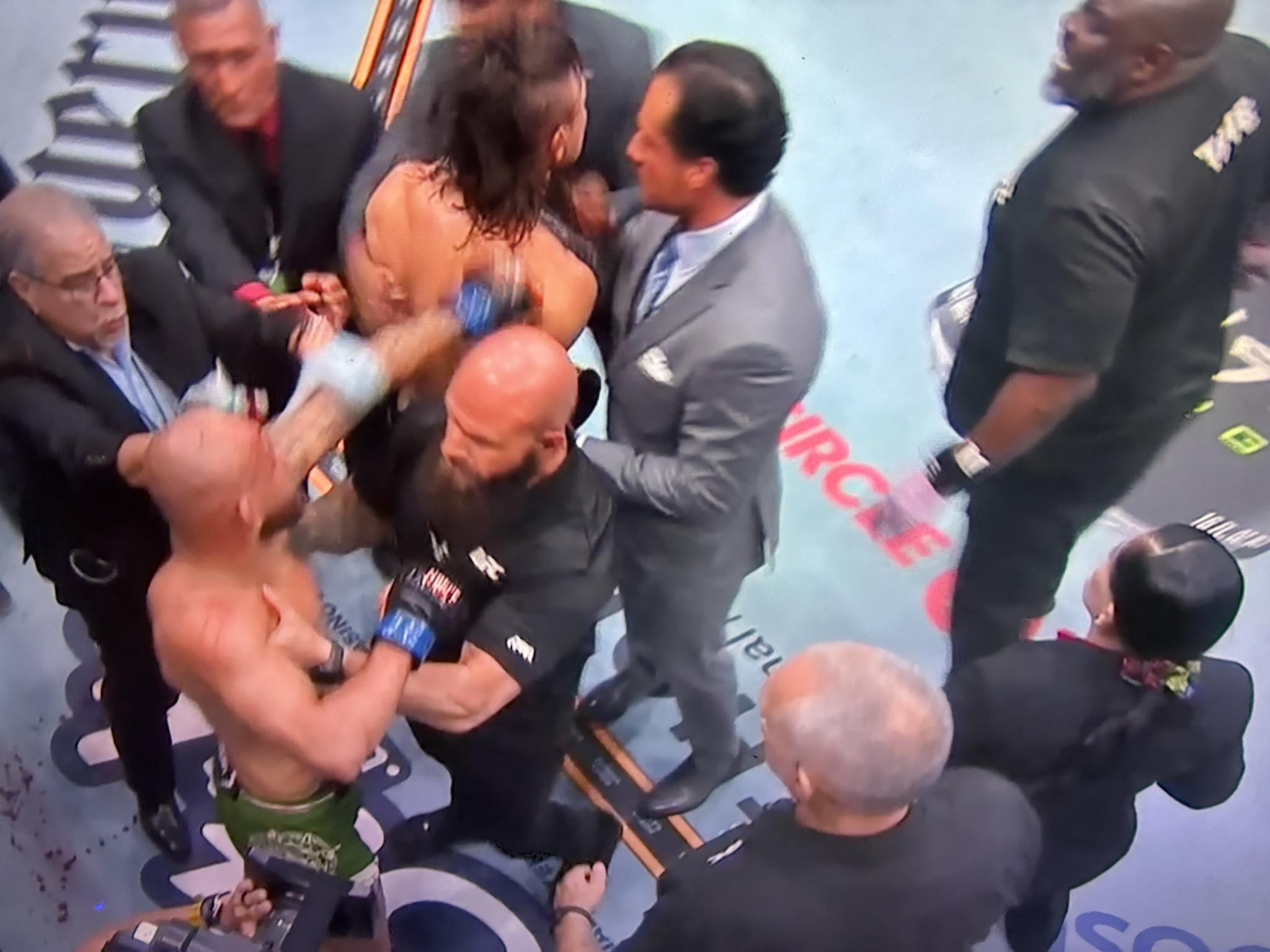 Jean Silva (left) throws a sucker punch at Diego Lopes after his defeat. Photo: Screenshot