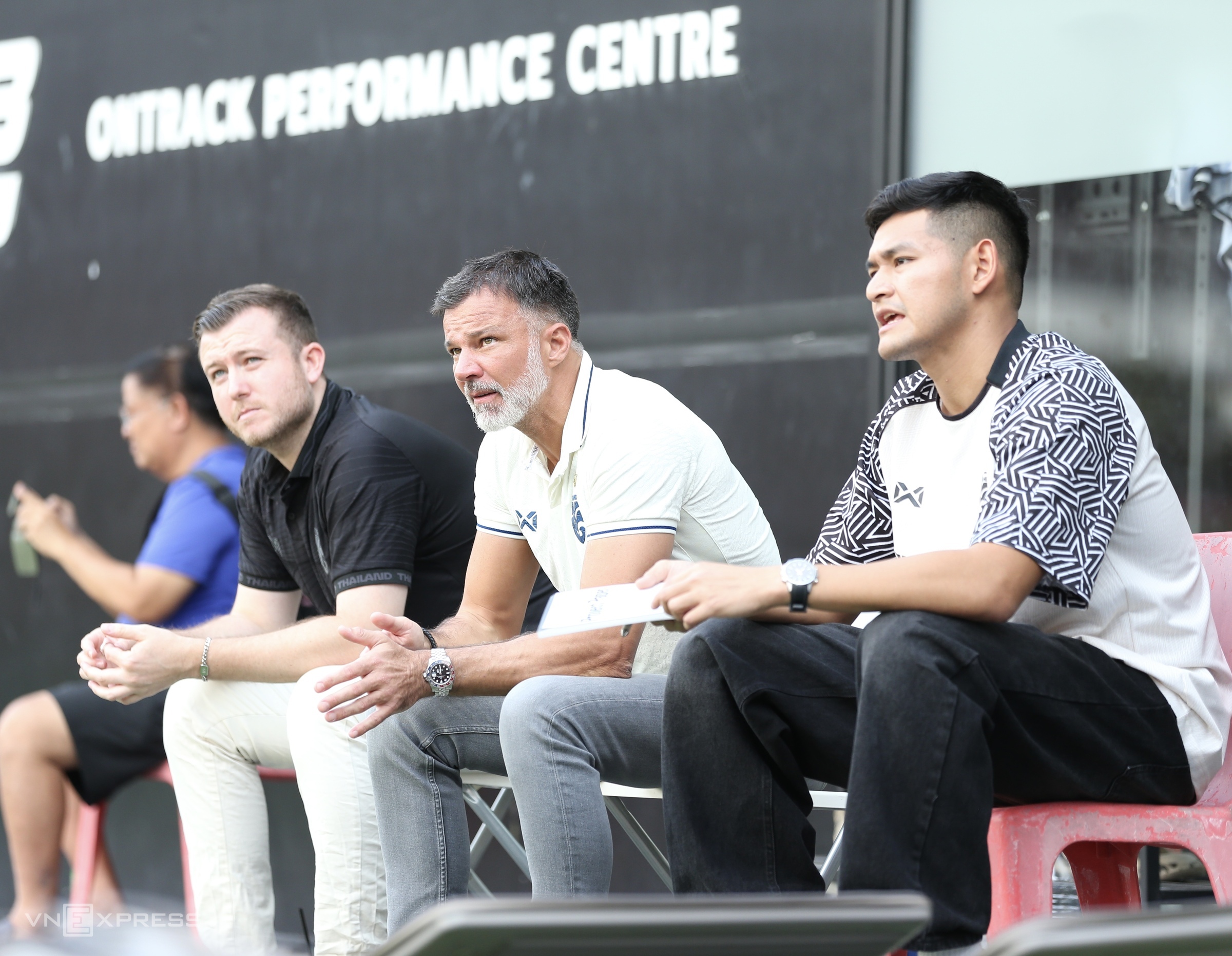 National team coach Anthony Hudson (center), accompanied by two assistants, was present at the STB Academy pitch in Bangkok to observe the U22 players' training session.