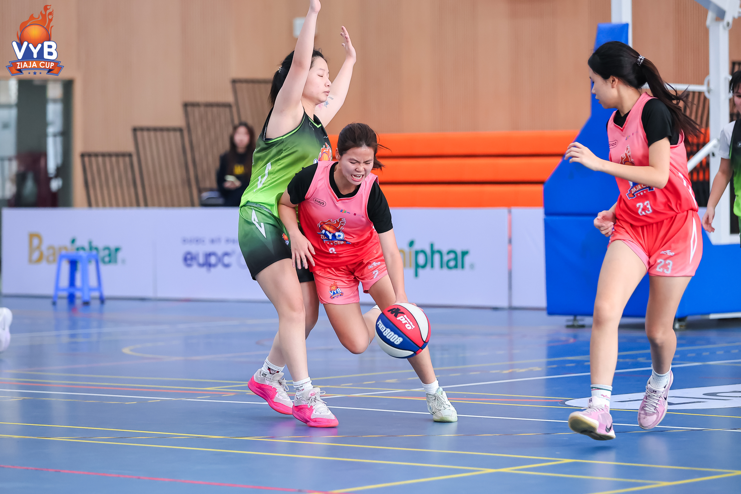 Ha My (pink, number 2) dribbles the ball during the VnExpress Youth Basketball Tournament semifinal at Ha Noi Children's Palace Campus 2 on 30/11. *Photo: VYB*