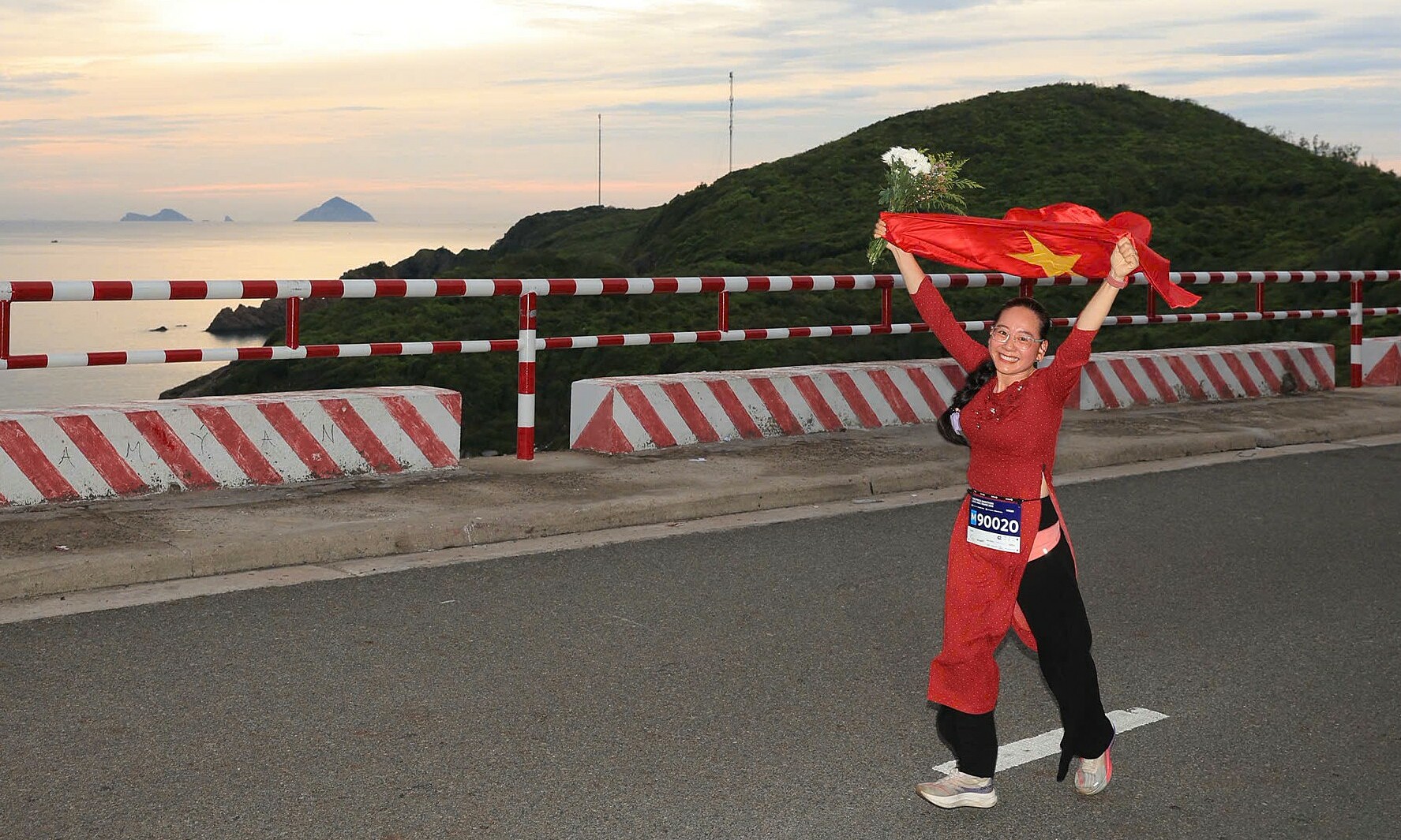 A female runner celebrates conquering Luong Son Pass. |