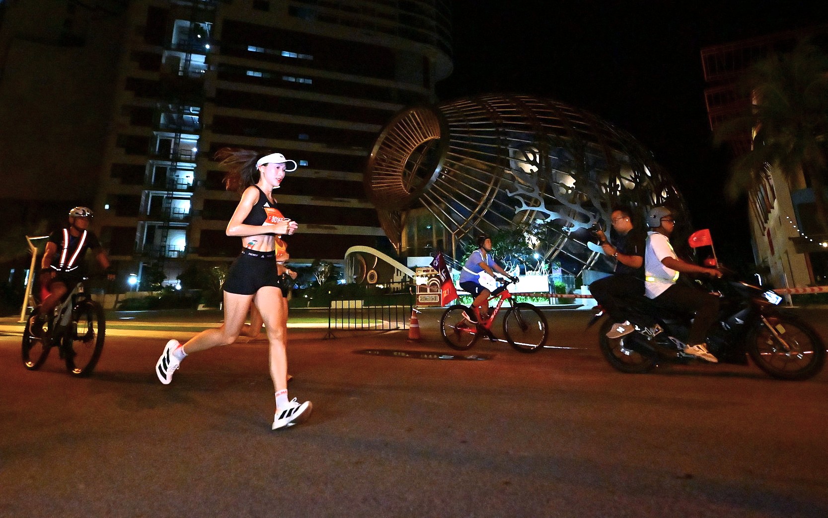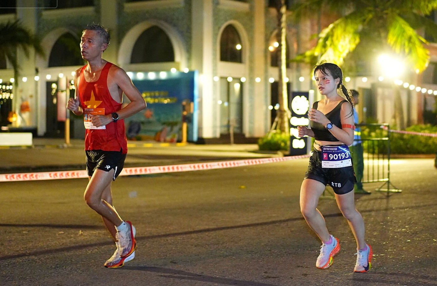 Tra Giang (bib 90193), a top 42km runner, strides through Libera Nha Trang. In addition to the existing lighting, organizers installed additional lampposts along the route to ensure a good racing experience during the night. |