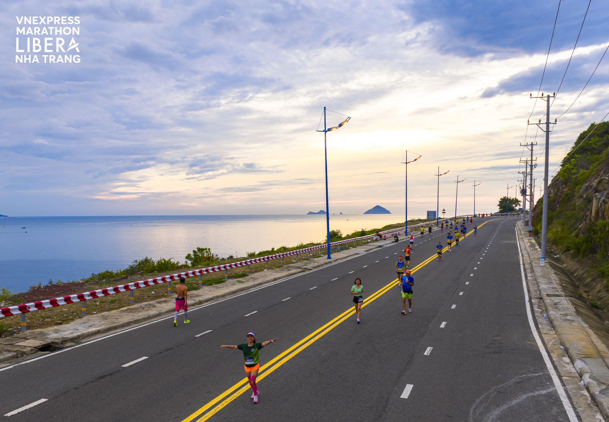 A 42km runner ascends Luong Son Pass at sunrise. Nha Trang Bay on one side and the cliffs on the other create a magnificent landscape rarely seen in Vietnamese races. |