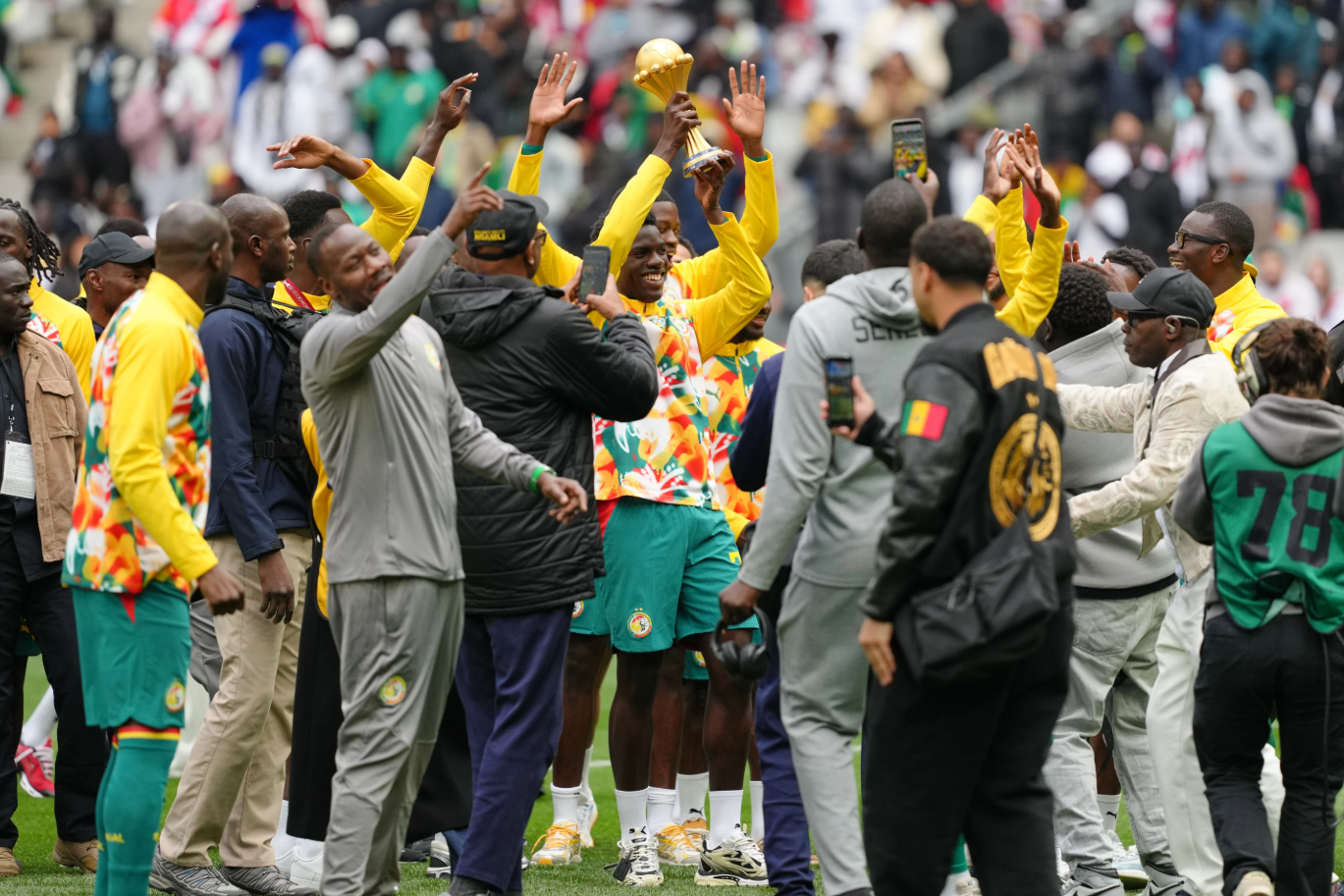 Approximately one hour before kickoff, captain Kalidou Koulibaly and his teammates carried the AFCON trophy onto the field for an honorary parade. This followed a performance by renowned Senegalese singer Youssou N'Dour. The Stade de France stands, nearly full, erupted as the team appeared, showcasing strong fan support.