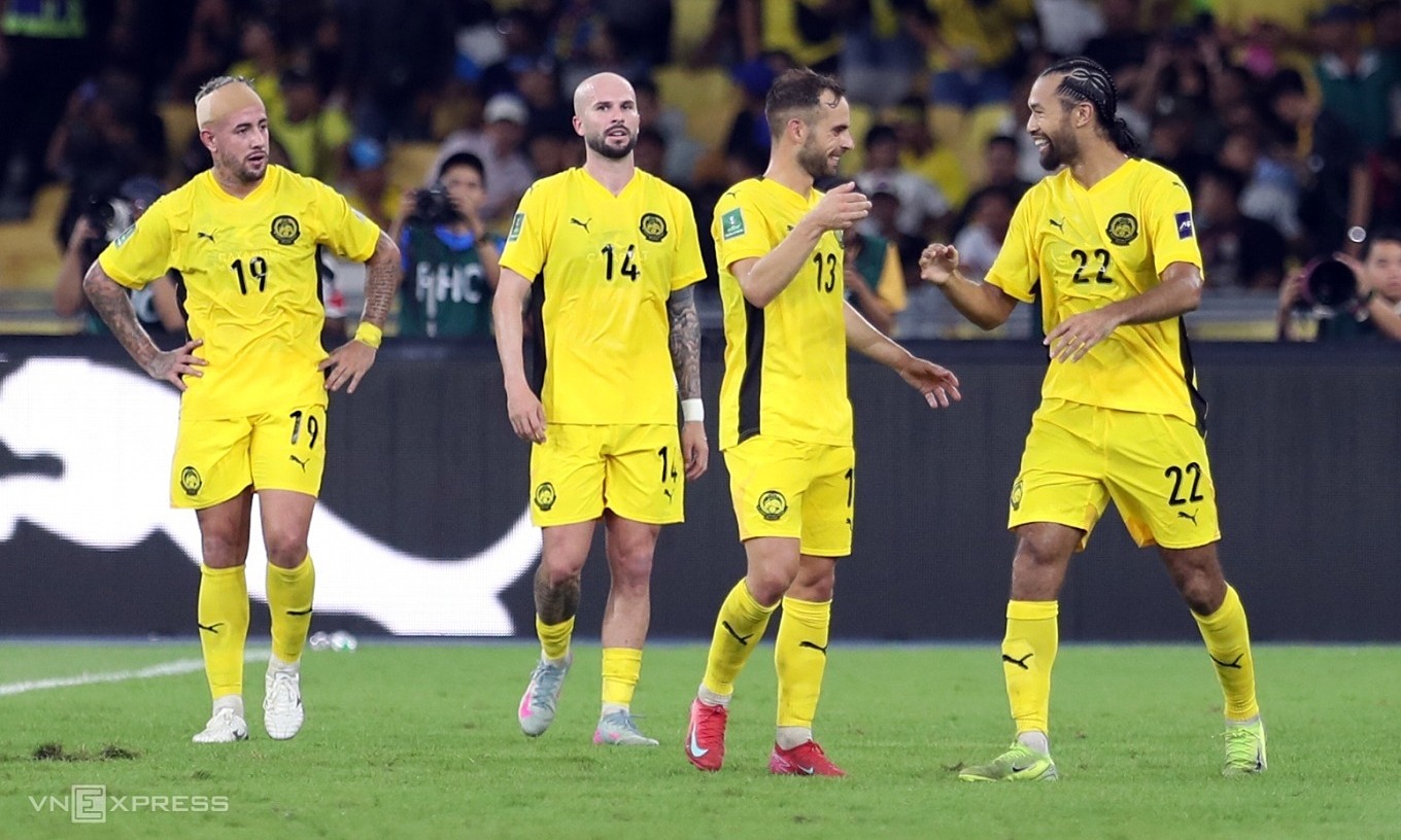 Joao Figueireido (number 14), Rodrigo Holgado (19), and Hector Hevel (13), among the seven Malaysian players penalized by FIFA, played in Malaysia's 4-0 victory over Vietnam in the second round of Group F of the final Asian Cup 2027 qualifiers, at Bukit Jalil Stadium, Kuala Lumpur, Malaysia on the evening of 10/6/2025. Photo: Hai Tu |