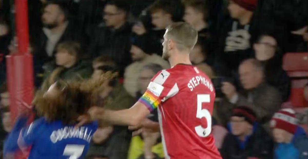 Jack Stephens. In 2024, during Southampton's 1-5 Premier League loss to Chelsea at St Mary's, the home captain unexpectedly pulled Marc Cucurella's hair, causing him to fall while preparing for a corner kick. At that moment, the ball was not in play, and Stephens had no reason to justify the physical contact with his opponent. After a VAR review, the referee issued a direct red card. Stephens was subsequently suspended for three matches.