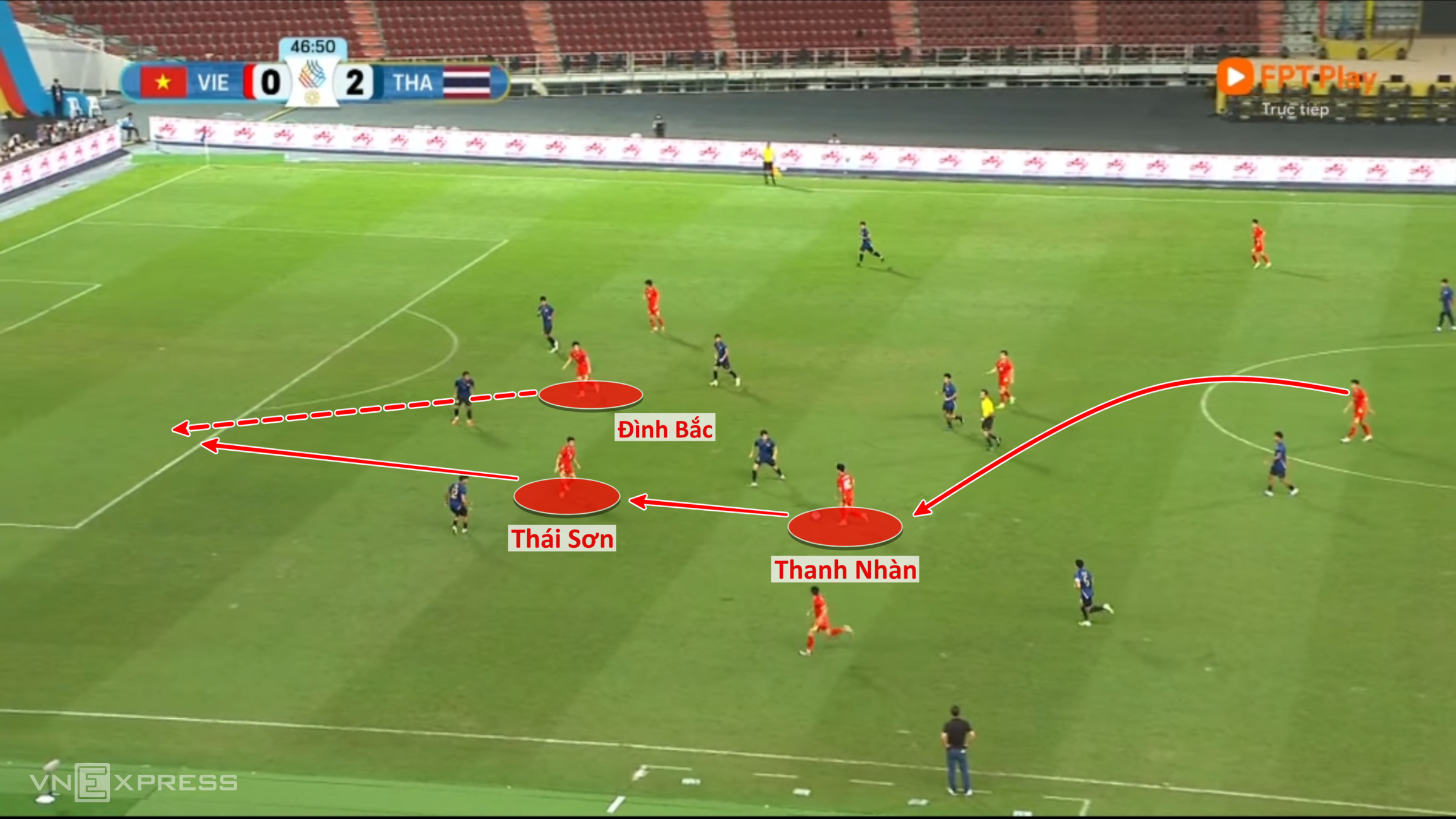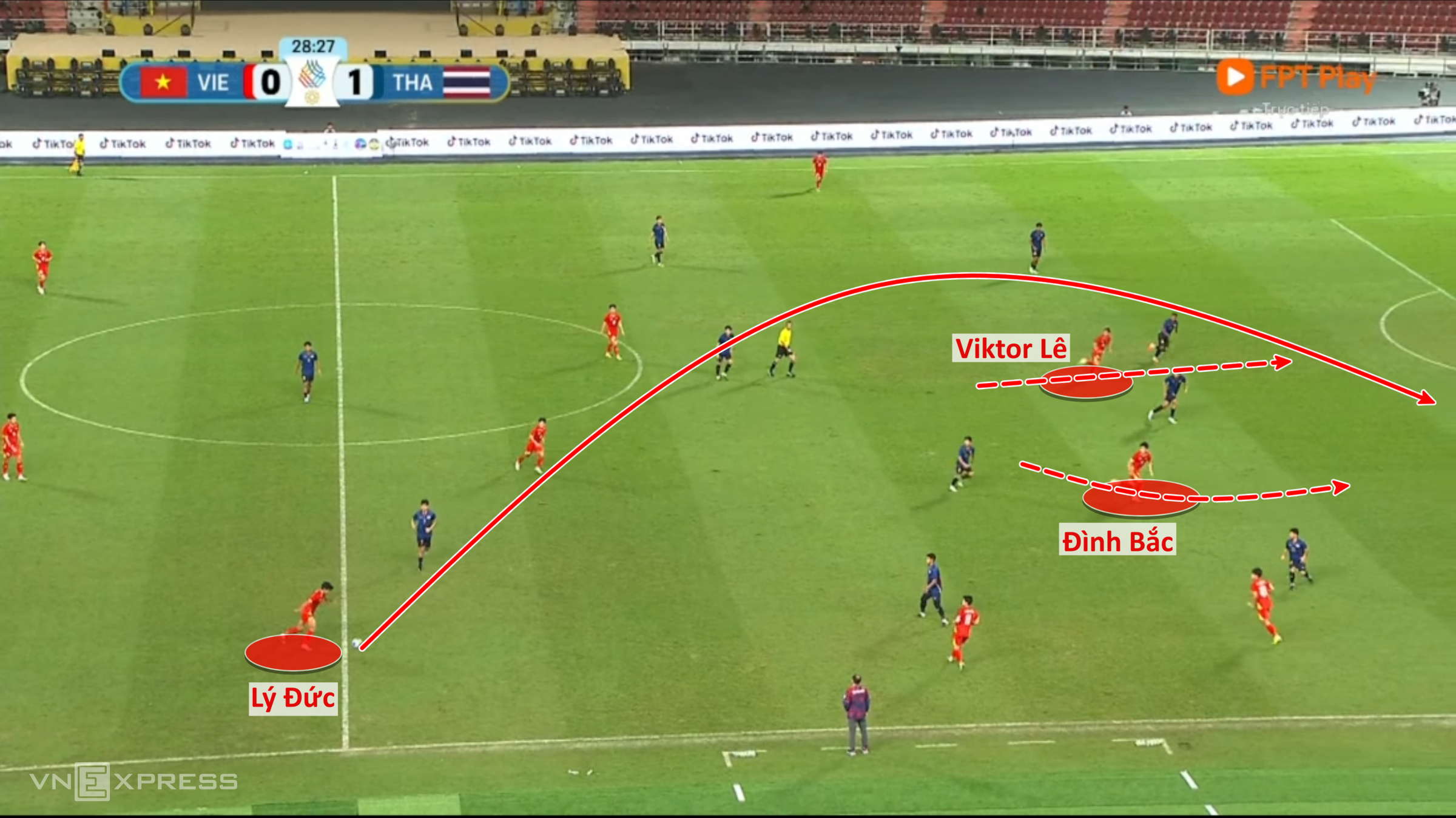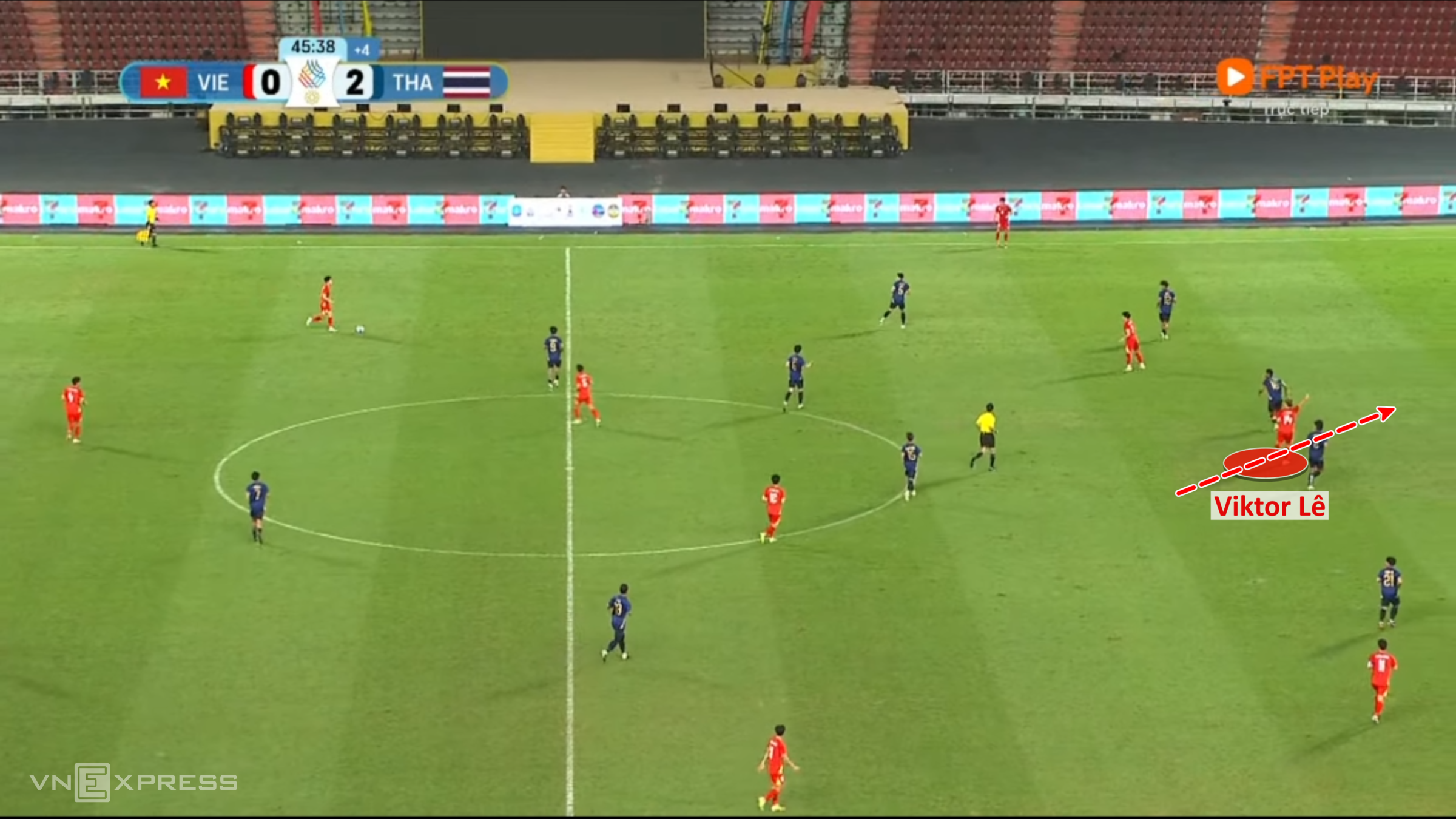 At certain moments, Dinh Bac tucked into the center as a false 9, while Viktor Le drifted left. The Ha Tinh Club player sometimes dropped deep with the intention of receiving a pass from the defensive line. However, Viktor Le more frequently positioned himself level with Thailand's defense, poised to burst forward and run in behind the opposition's backline.