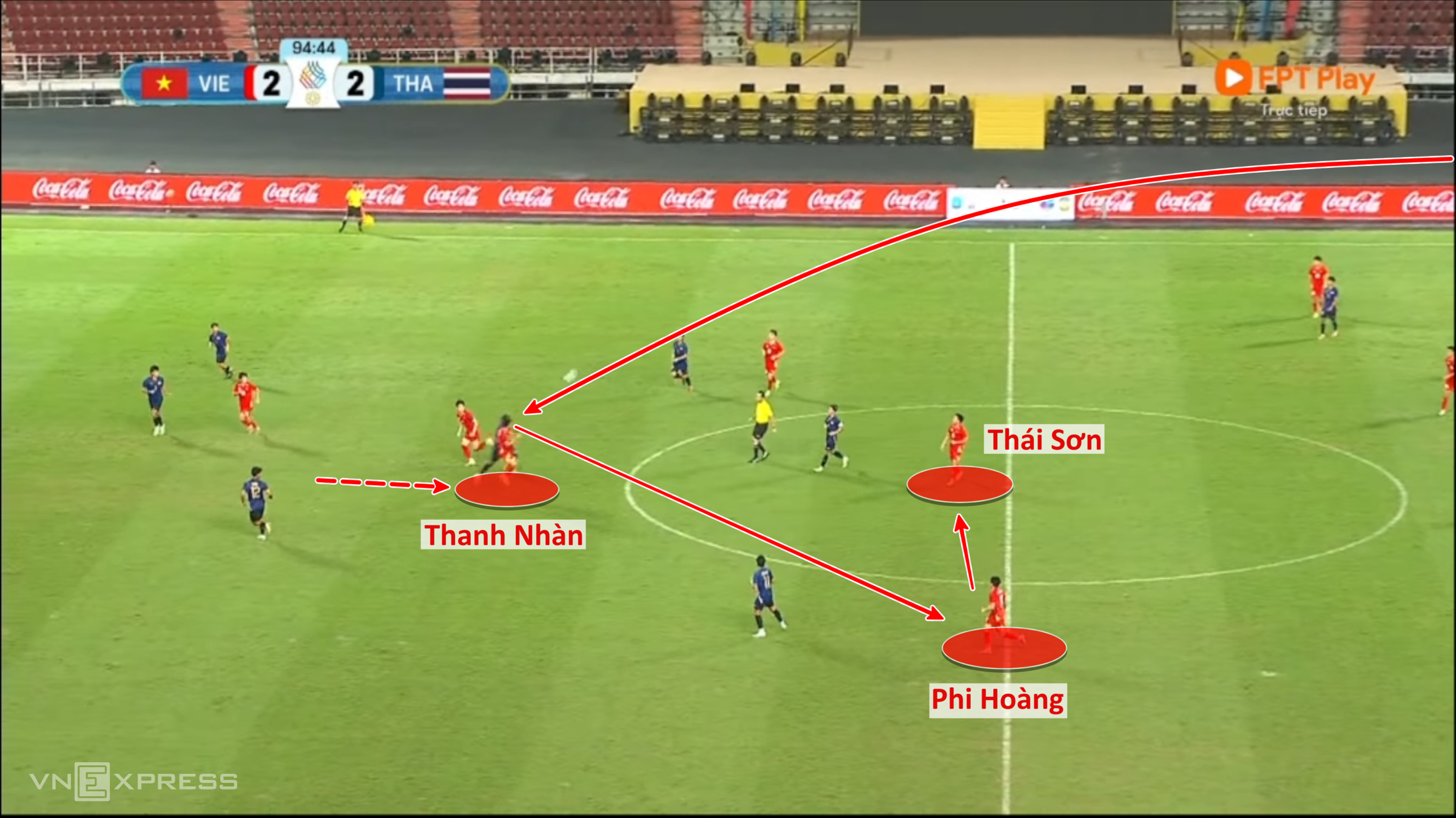 The opportunities to contest second balls also increased with more players positioned close together. For instance, in the 95th minute, Thanh Nhan contested the first aerial ball near the center circle, Phi Hoang won the second ball, before Thai Son, nearby, delivered a line-breaking pass, sparking the situation that led to Vietnam sealing the 3-2 victory, with the PVF-CAND player himself scoring.