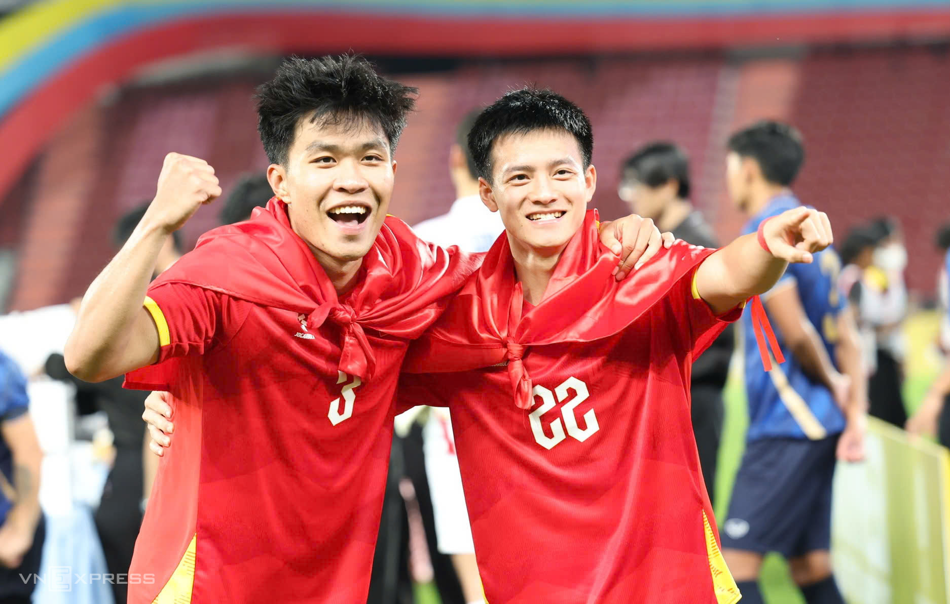 Thanh Nhan (right) celebrates with Ly Duc after Vietnam's victory over Thailand in the SEA Games 33 final at Rajamangala Stadium, Bangkok on the evening of 18/12. Photo: Duc Dong |