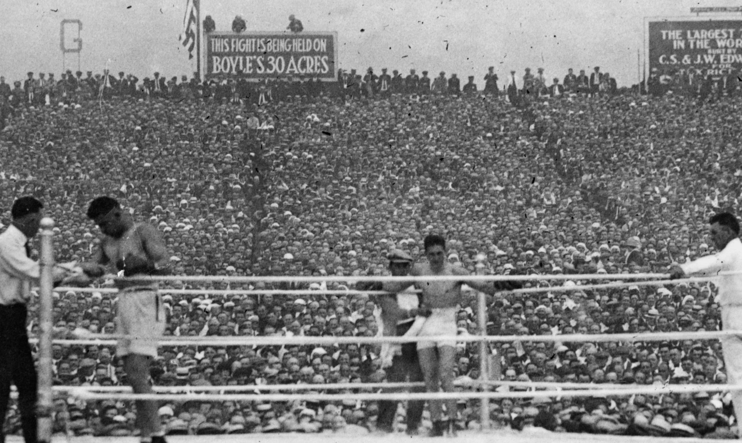 Over 80,000 people came to Boyle’s Thirty Acres to watch the world heavyweight title fight between Jack Dempsey and Georges Carpentier on 2/7/1921. Photo: Thefightcity
