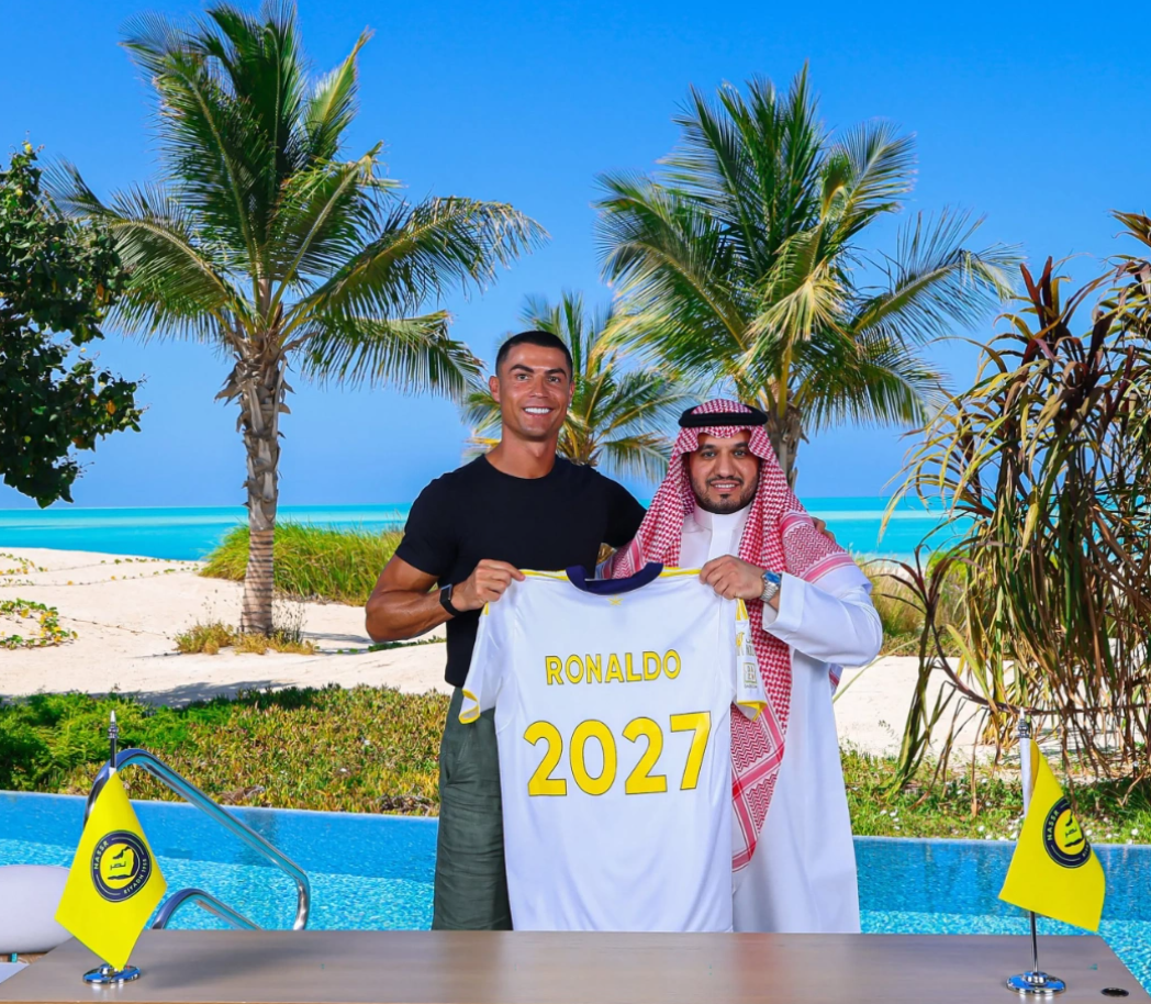 Cristiano Ronaldo (left) and Al Nassr President Abdullah Al-Majed during the contract extension announcement on 26/6. Photo: Al Nassr