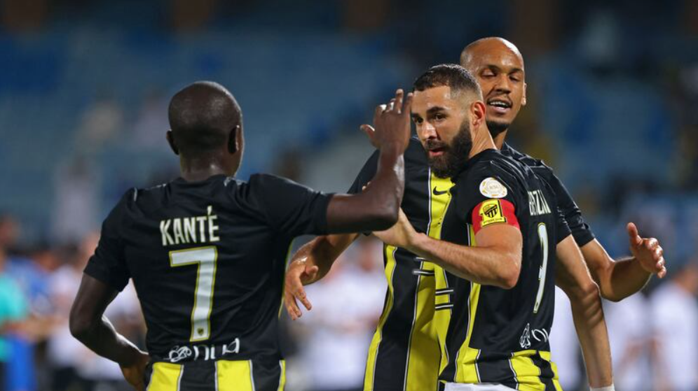 N'Golo Kante, Karim Benzema, and Fabinho (from left to right) in Al Ittihad jerseys. Photo: AFP