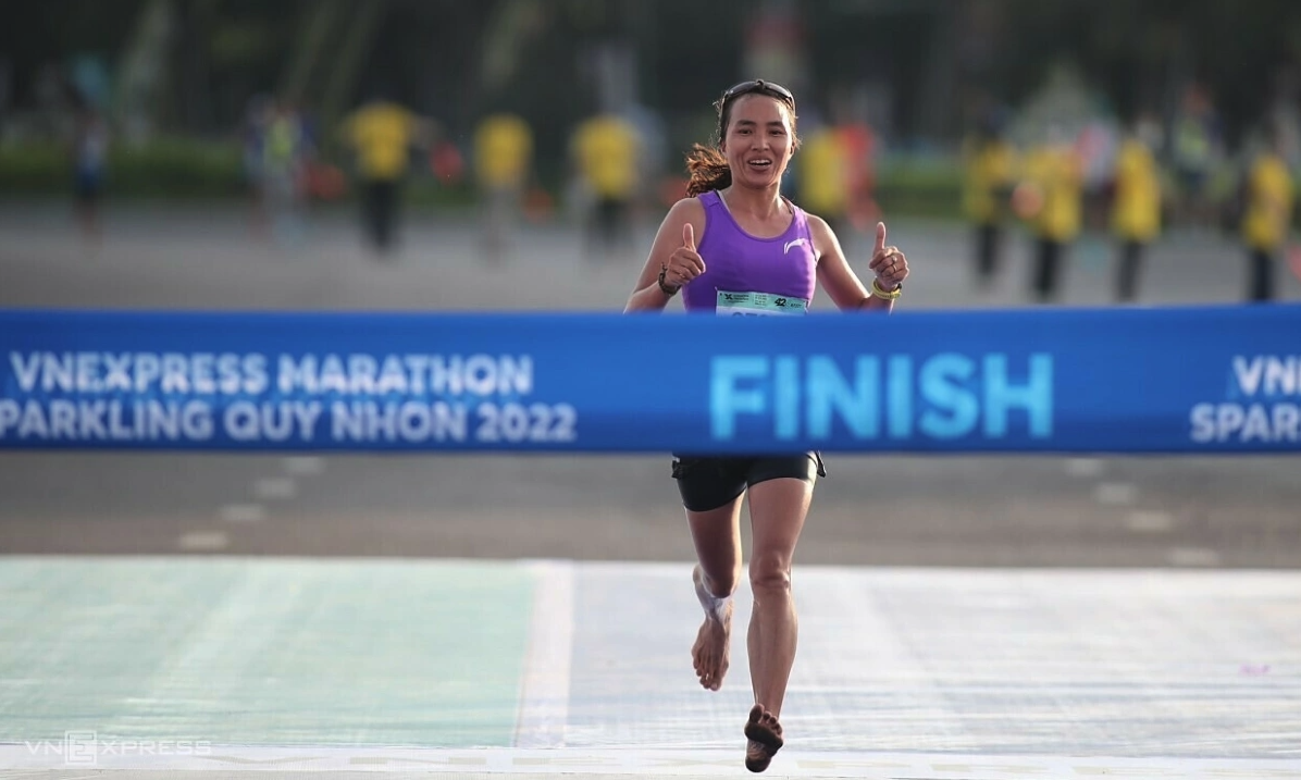 Pham Thi Binh ran barefoot to win the 42km VnExpress Marathon Quy Nhon 2022. Photo: VnExpress Marathon