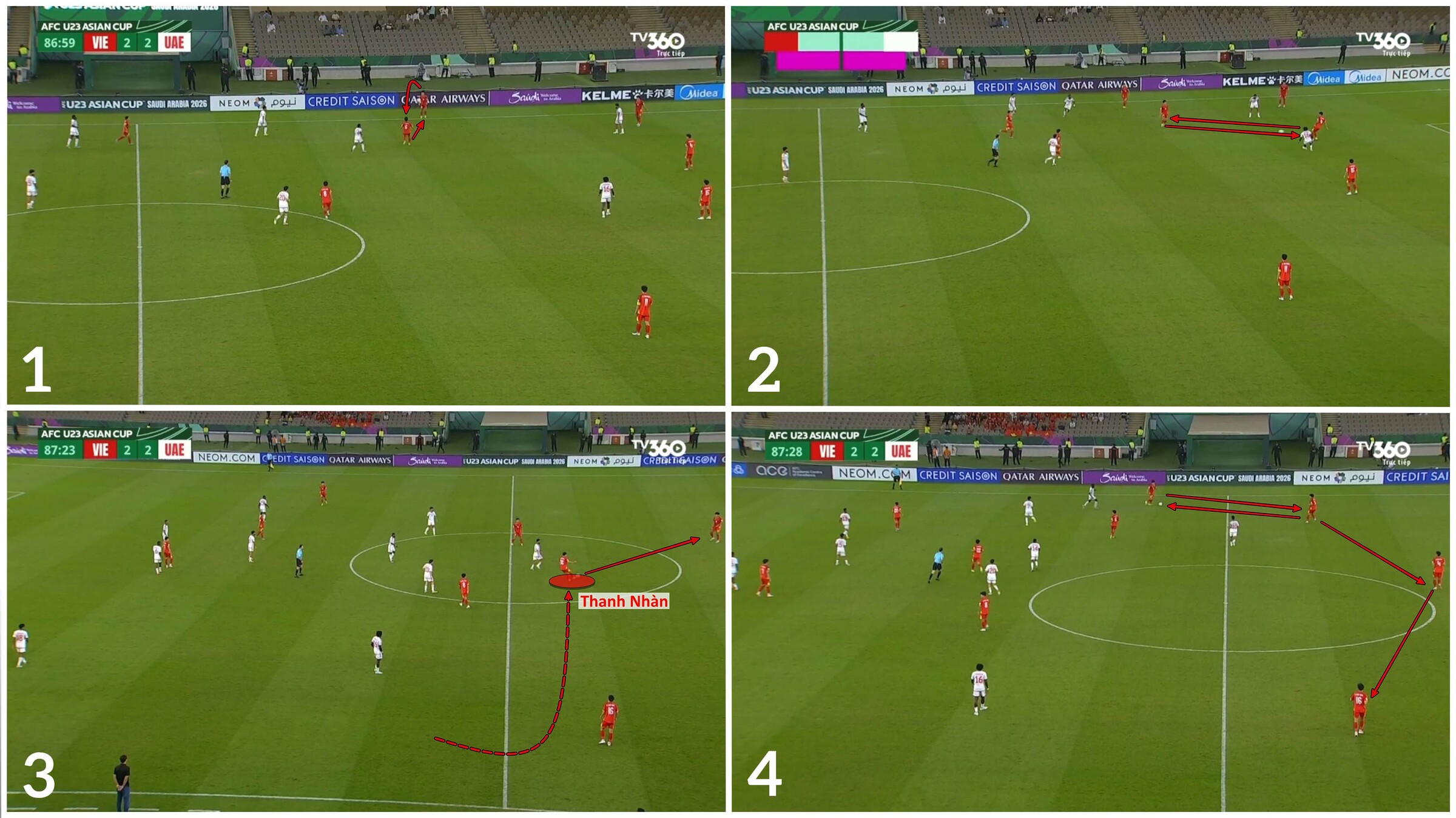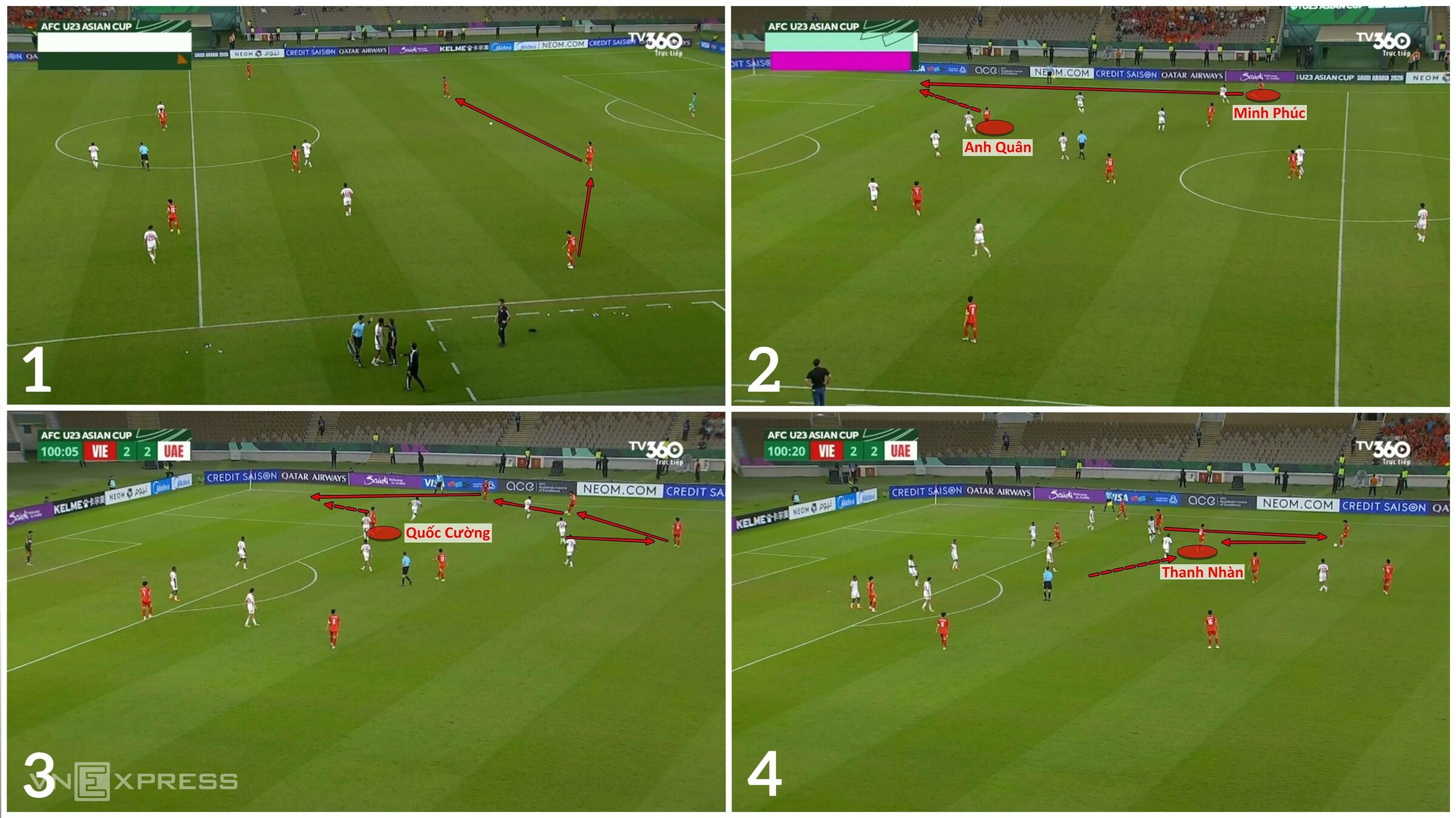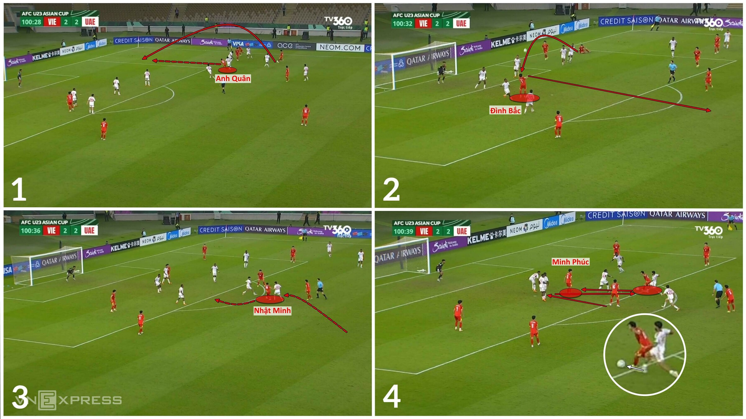 Among these 4 goals, Dinh Bac's strike against UAE stood out, arguably setting a new record for U23 Vietnam in the tournament for originating from the longest sequence of consecutive passes.