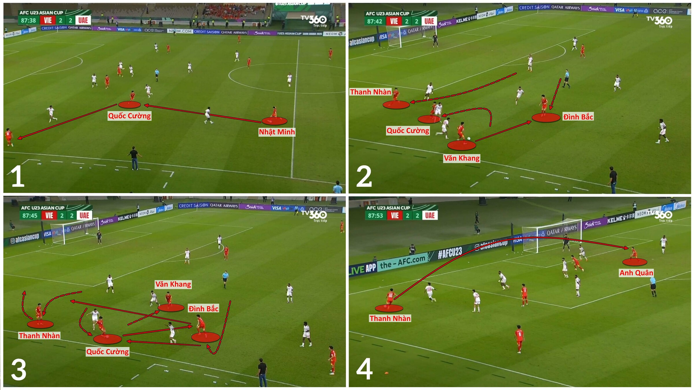 The intricate weaving play displayed on the left wing, with Nhat Minh's through ball for the quartet of Dinh Bac, Quoc Cuong, Van Khang, and Thanh Nhan to combine, make runs, and dismantle the opponent's defense. Screenshot