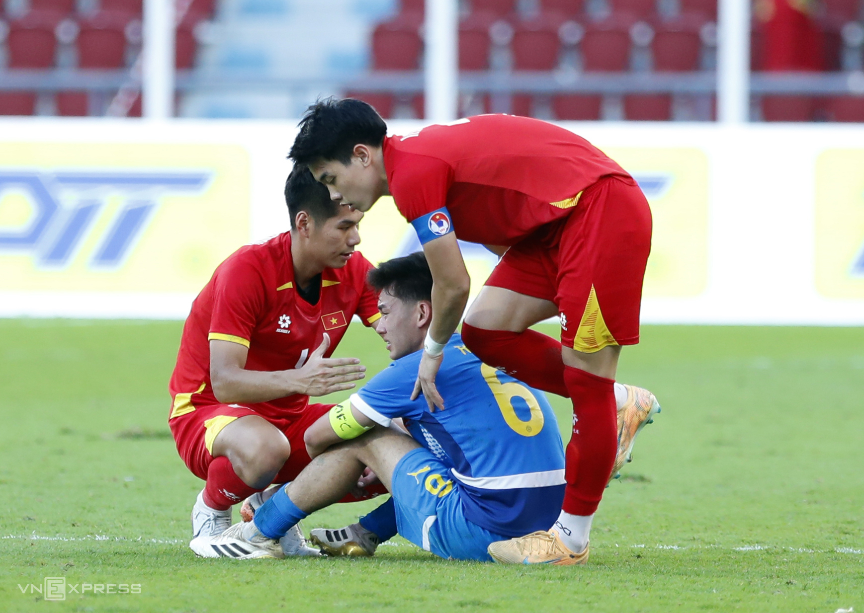 Thanh Nhan (number 22) ran towards Stand A to celebrate in front of the Vietnamese fans. His teammates immediately rushed to embrace him. The forward born in 2003 then kissed the Vietnamese flag on his left chest and clenched his fists, shouting loudly. After the match, Thanh Nhan stated that this goal relieved a lot of pressure for him after a long period without scoring for the national team.