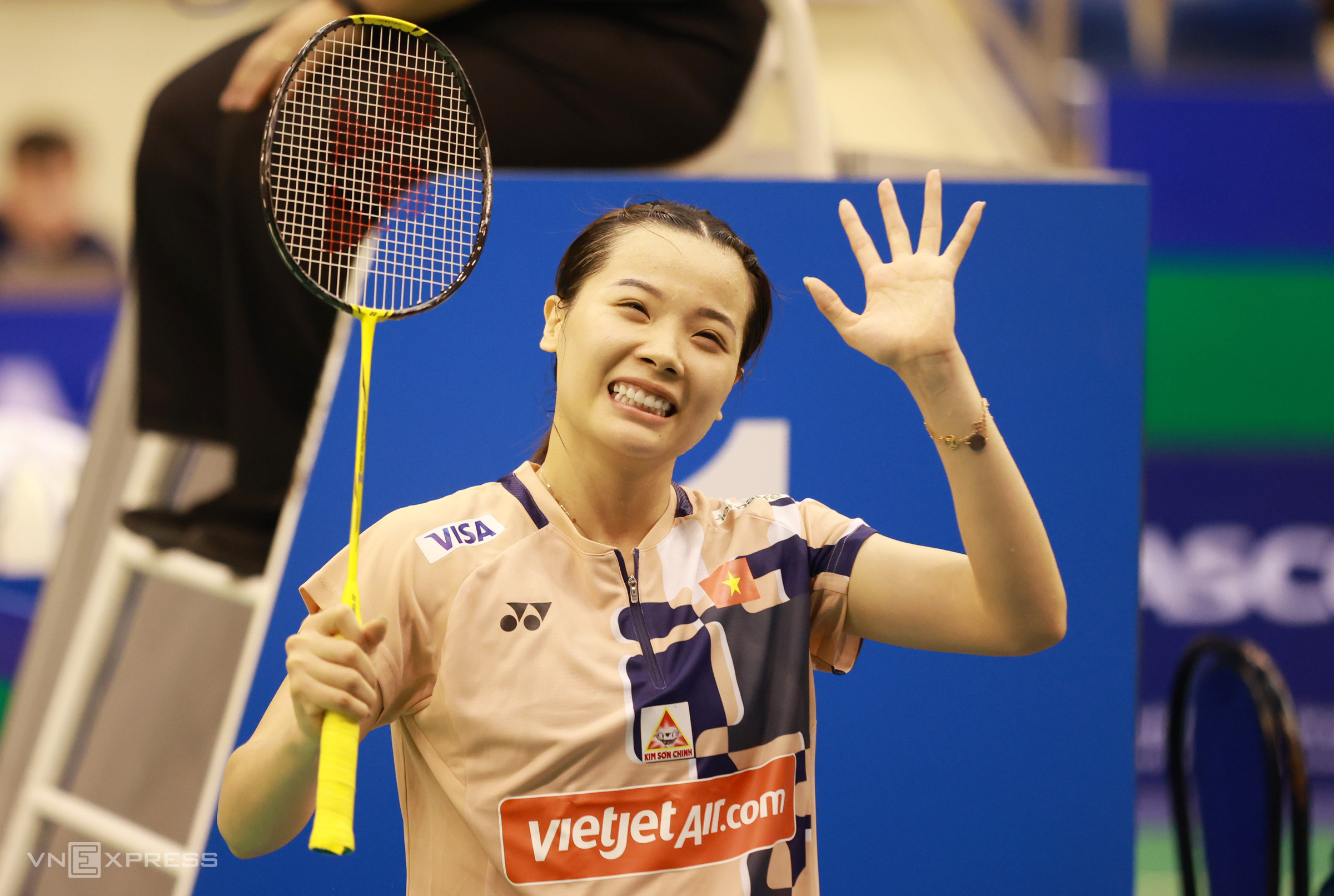 Nguyen Thuy Linh celebrates her victory in the first round of the Vietnam Open 2025. Photo: Duc Dong
