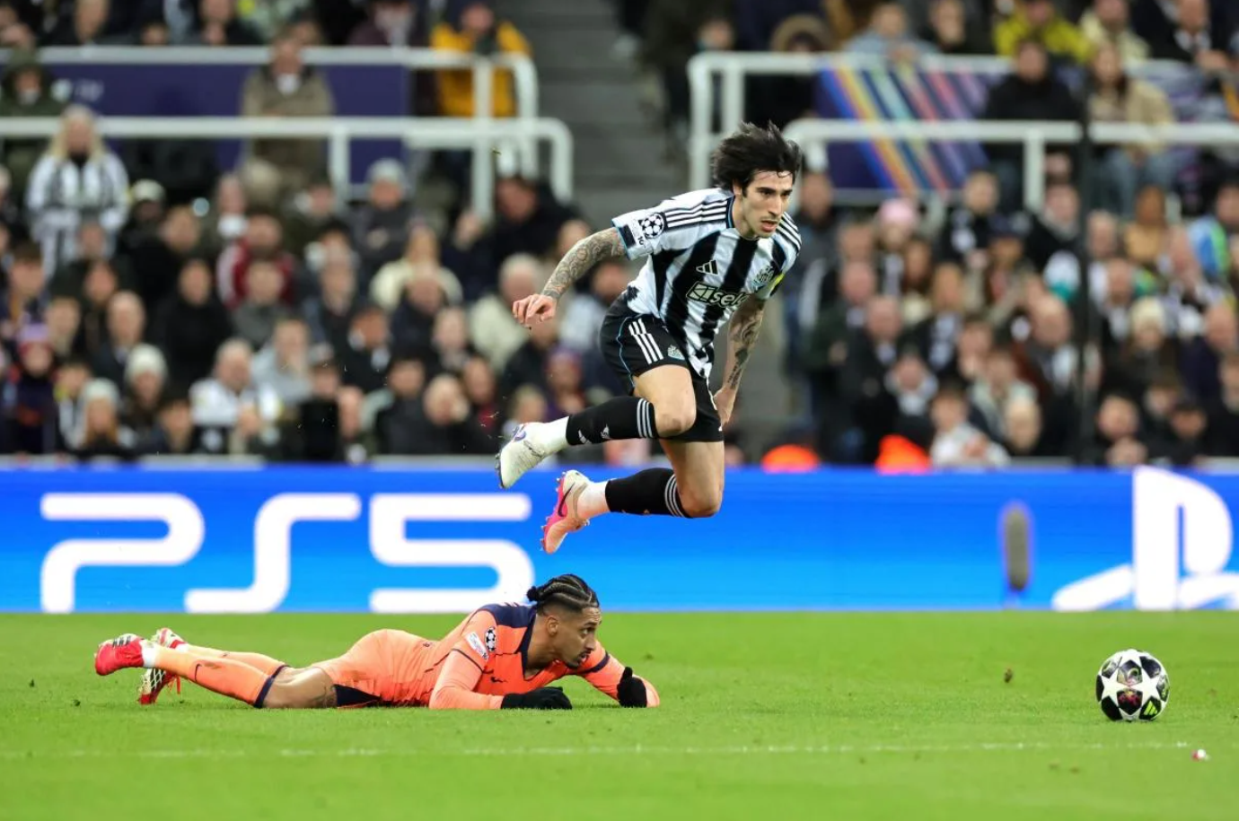 Sandro Tonali (top) vies for the ball with Raphinha during Newcastle's 1-1 draw against Barca in the Champions League play-off first leg at St. James Park, Newcastle, England on 10/3/2026. *Photo: Yahoo Sports*