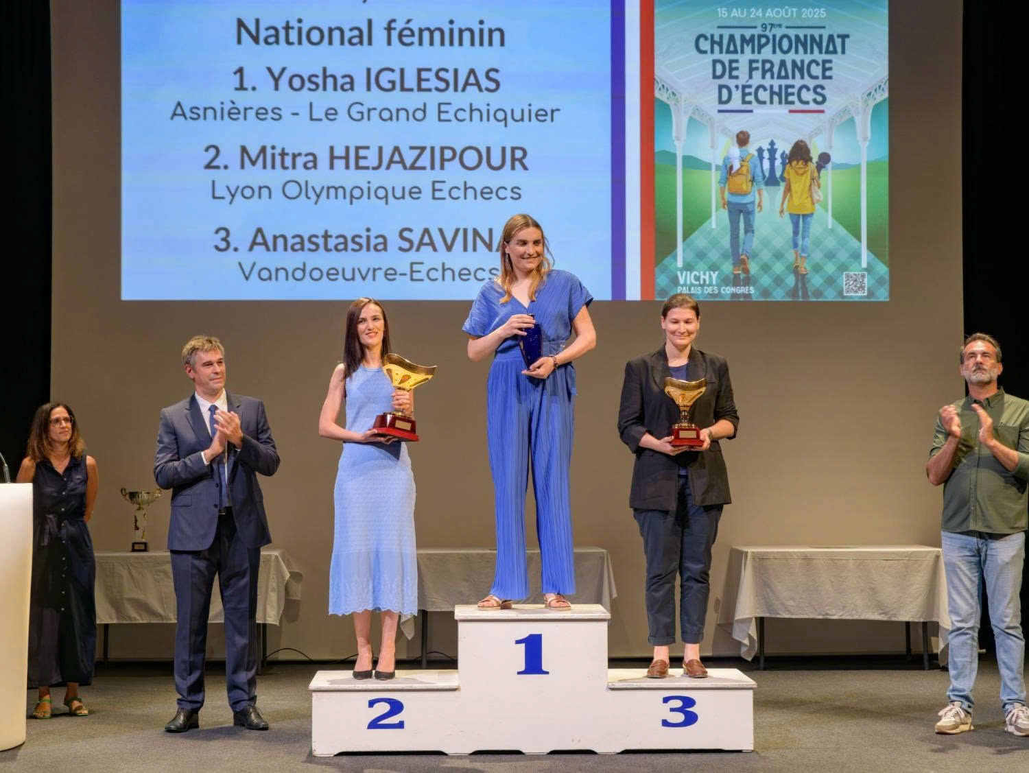 Yosha Iglesias on the podium after winning the French Women’s Chess Championship on 24/8/2025. Photo: French Chess Federation |