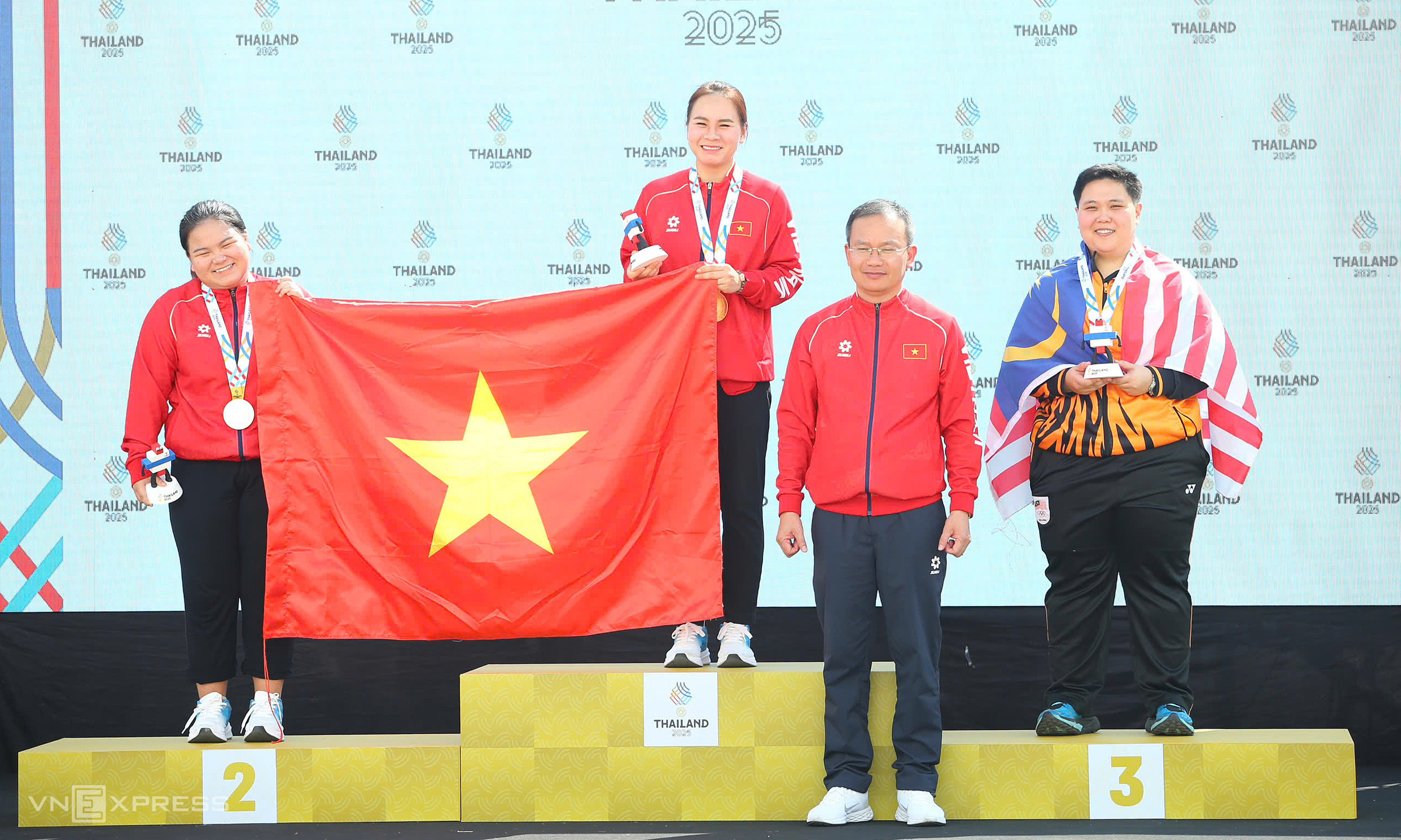 Despite her victory, Vinh maintained a composed expression, only smiling when shaking hands with her opponent and accepting the award alongside Thuy Trang. The 25-year-old shooter chose not to pose for individual photos with her gold medal, instead standing with Thuy Trang as they jointly held the national flag.