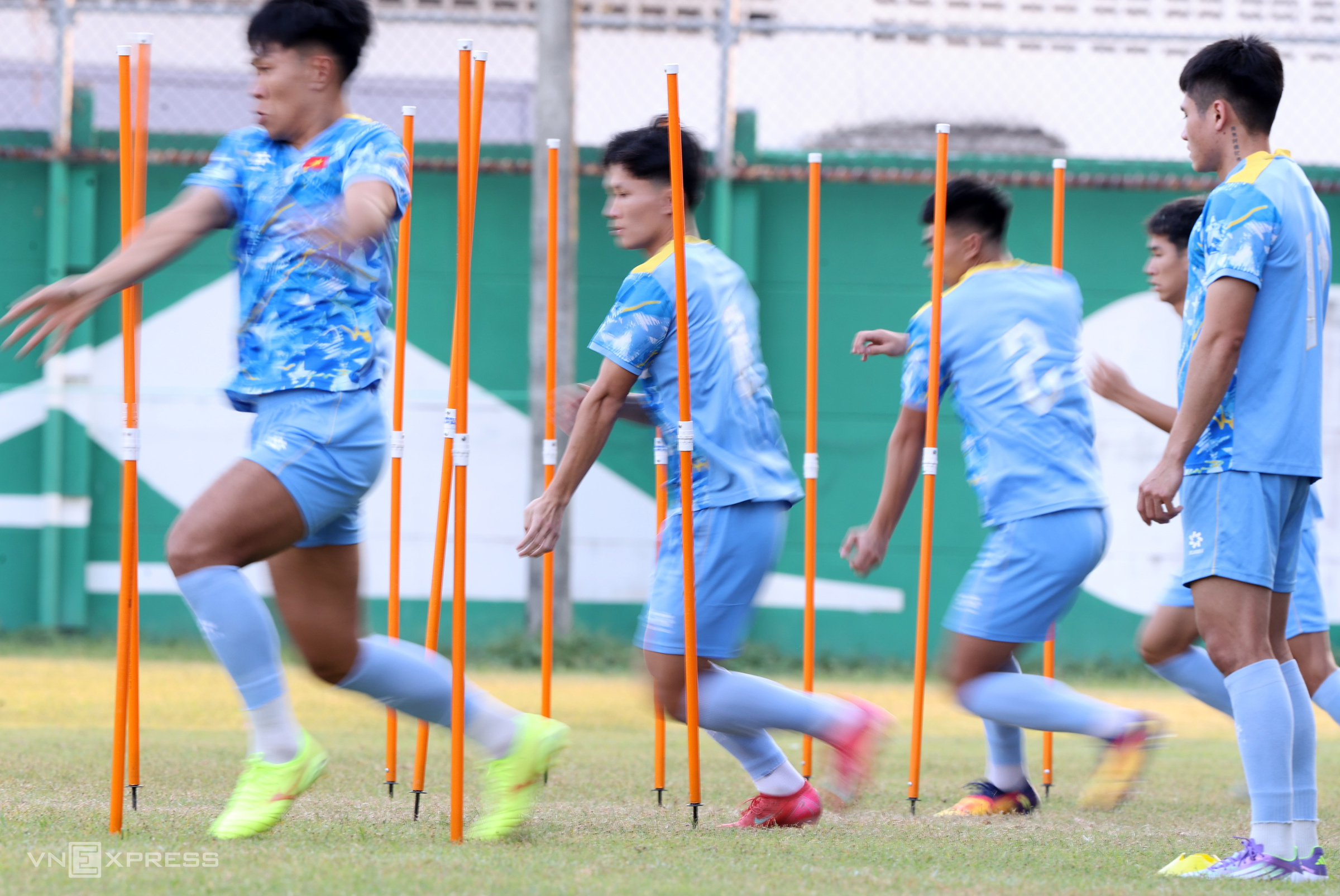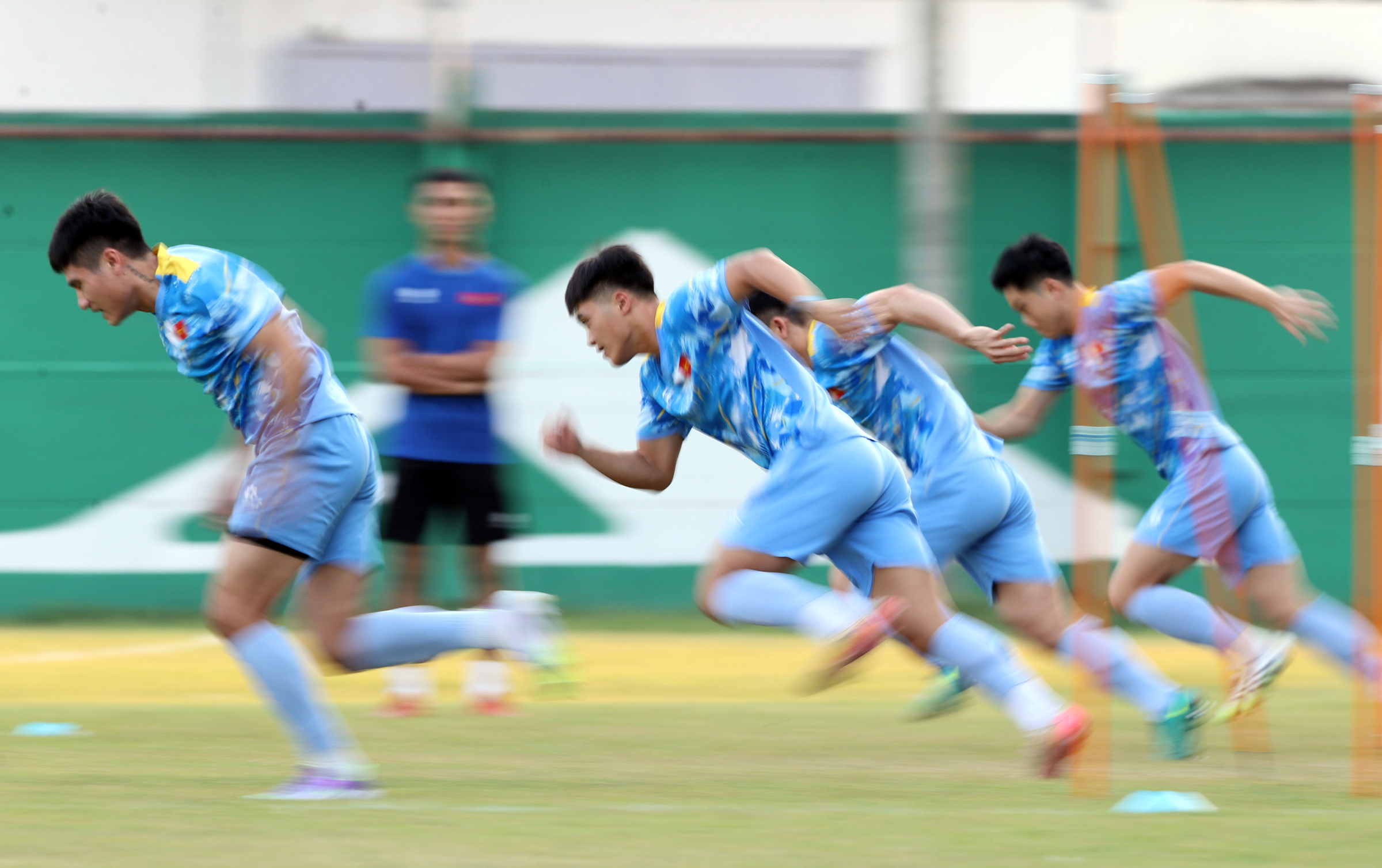 Players engaged in speed drills. Among the 23 players on the roster, currently no one is injured, and all are ready for the match against Laos.
