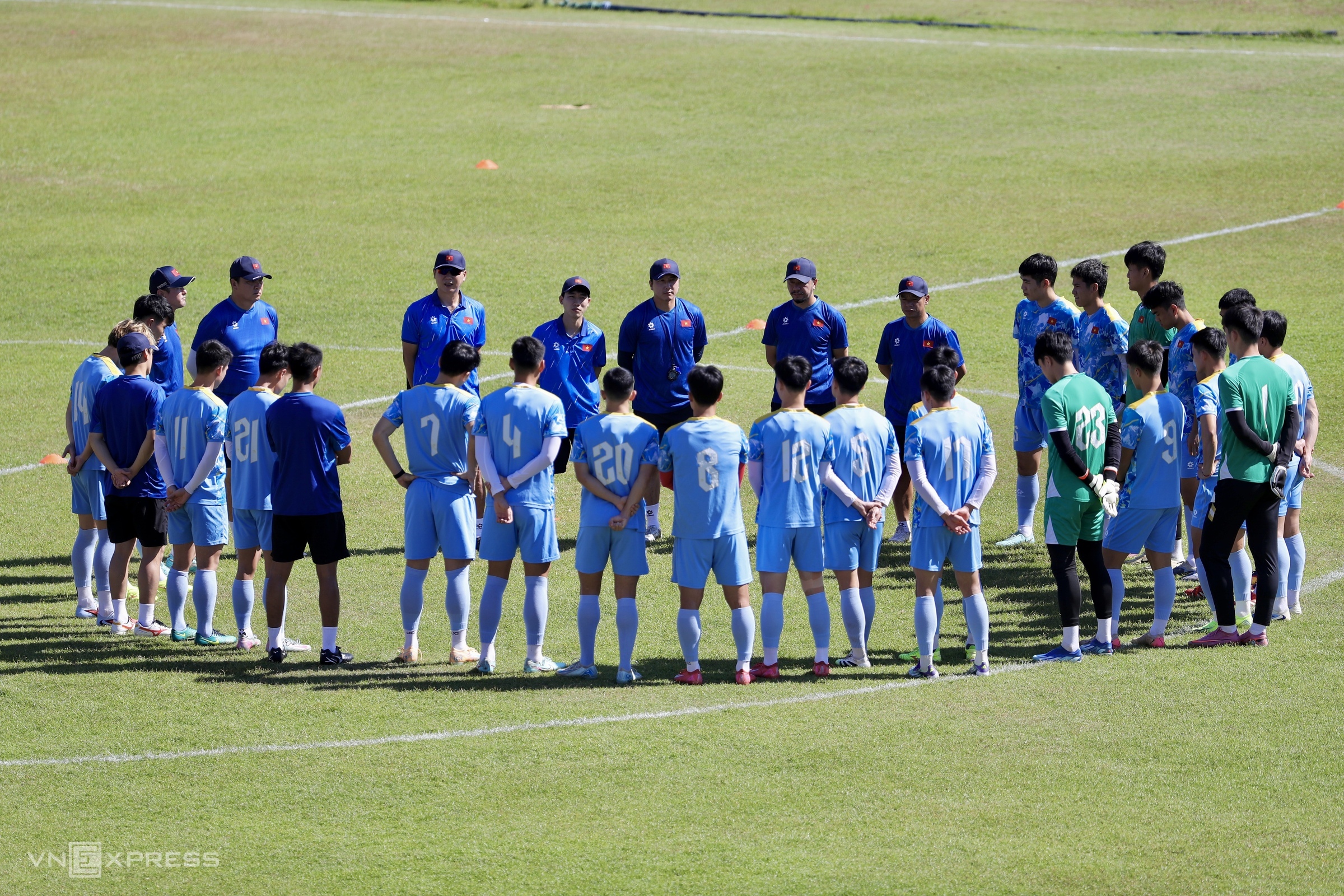 The hot conditions prompted many players to frequently wipe sweat from their faces. The full squad of 23 players was present. Midfielder Nguyen Xuan Bac (front, center) returned after a minor injury that had forced him off early in the 2-1 victory against Laos on 3/12. |