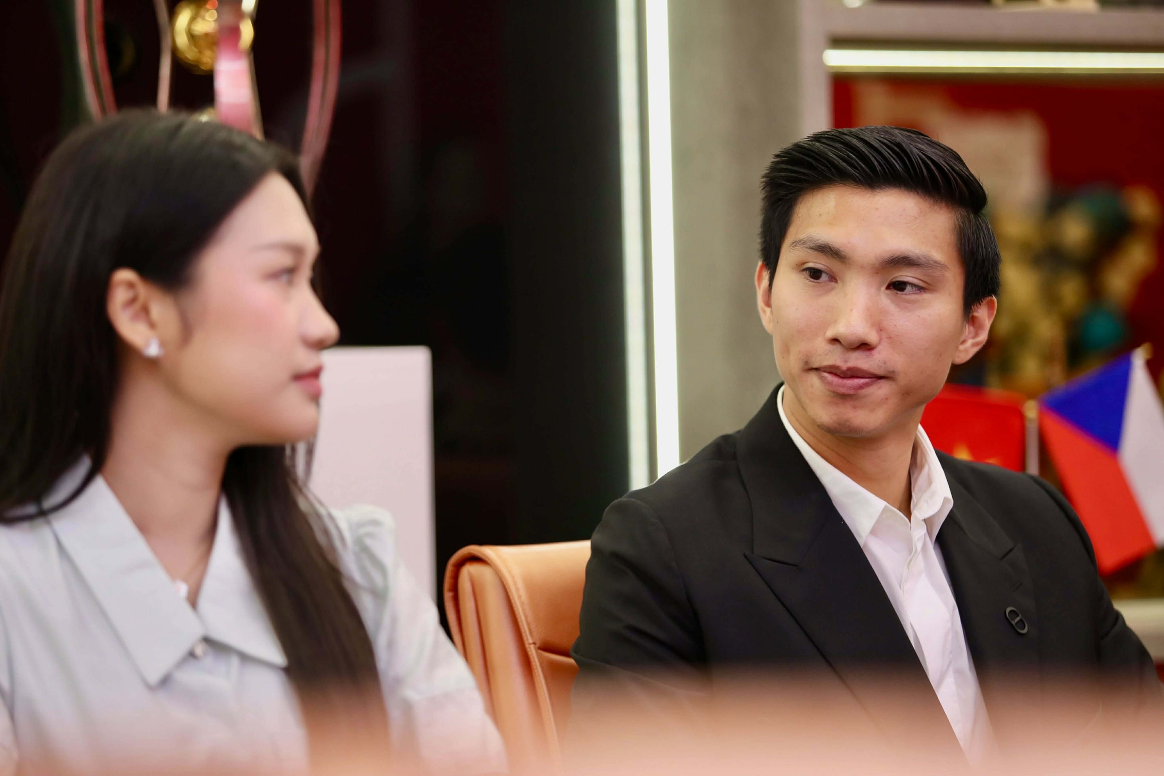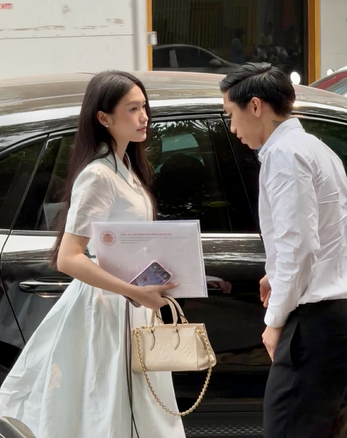His wife, Doan Hai My, accompanied him to the ceremony at the club's headquarters in Ha Noi. Van Hau wore a white shirt with a tuxedo jacket, while Hai My opted for a light-colored long dress and simple accessories. He drove them to the venue and opened the door for his wife upon arrival.