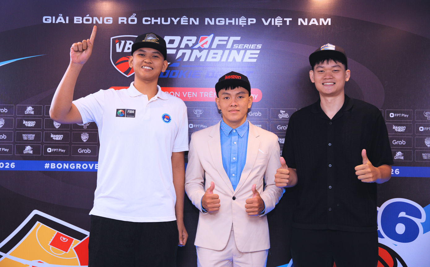The three athletes Lam Binh Duy, Nguyen The Dang, and Tran Minh Tien (from left to right) celebrate after the VBA Draft 2026, held on 17/4. *Photo: VBA* |