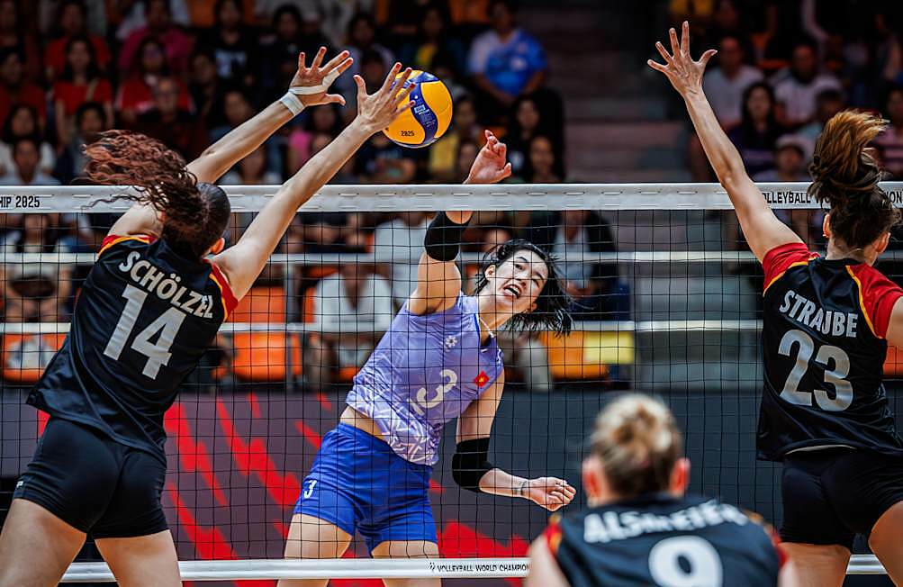 Outside hitter Thanh Thuy attacks against the German block during the second round of Group G at the 2025 FIVB Volleyball Women's World Championship in Thailand on 25/8/2025. Photo: FIVB |