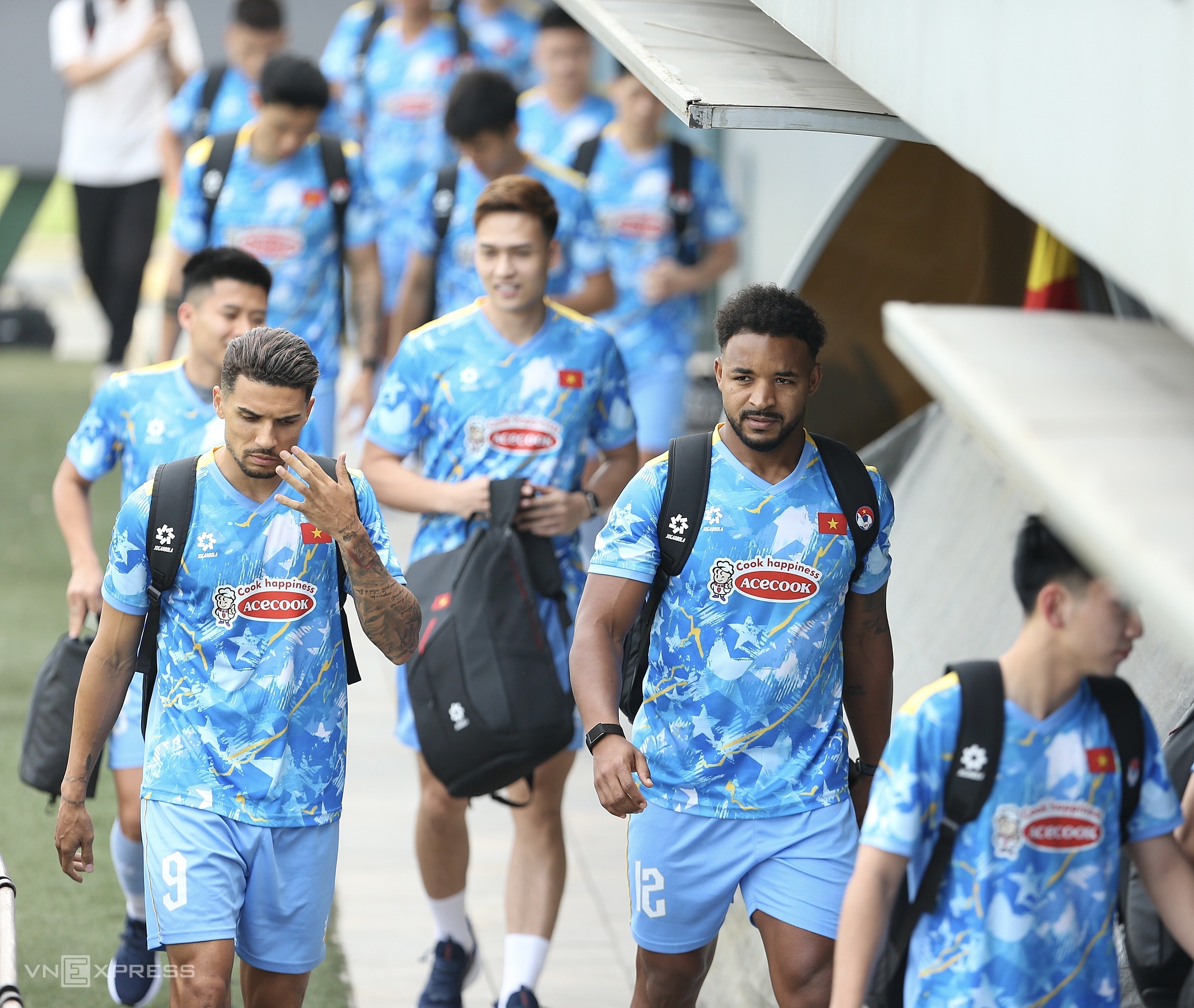 Do Hoang Hen (number 9) and Nguyen Xuan Son (12) arrive at the training ground at the Vietnam Youth Football Training Center in Hanoi on 24/3/2026. Photo: Hieu Luong