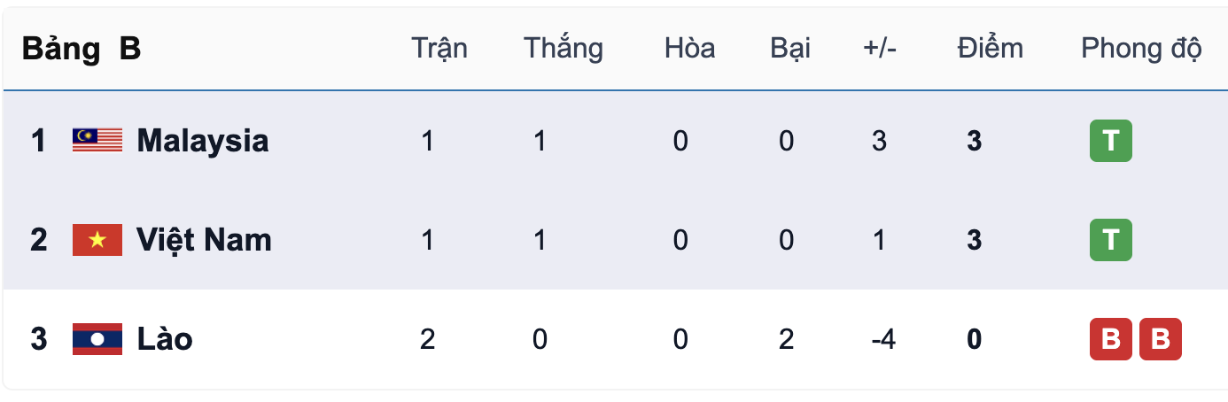 In Group B, Laos has been eliminated. Malaysia leads with three points, level with Vietnam, but ranks higher due to a superior goal difference (+3 compared to +1). In their final match, Vietnam must win to secure the top spot. If they draw, coach Kim Sang-sik's team will finish second with 4 points but will still advance, as Singapore (Group A), Indonesia, and Myanmar (Group C) can only reach a maximum of three points.