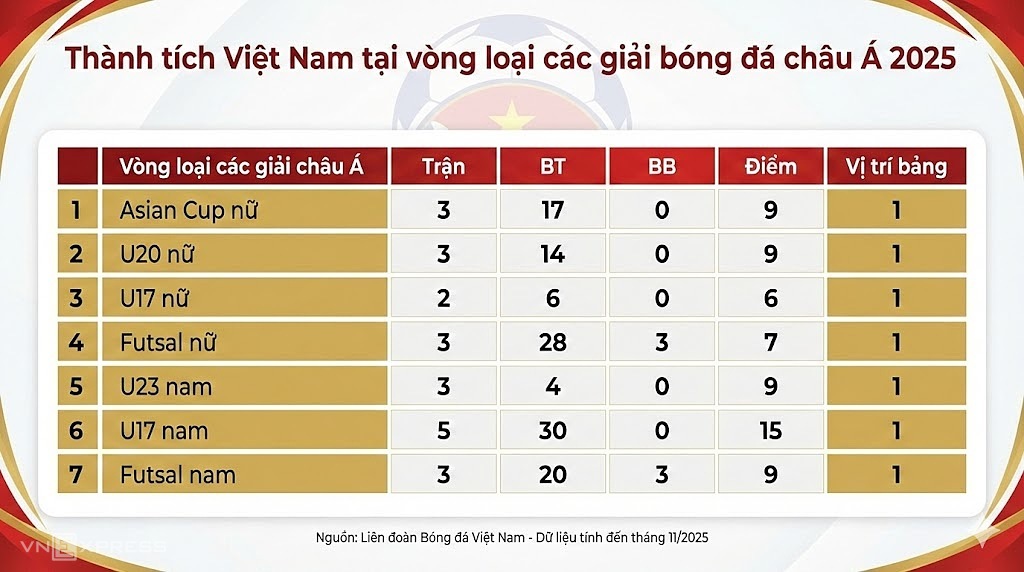 In the Asian Cup Women 2026 qualifiers held in 7/2025, coach Mai Duc Chung's team won all three matches against Maldives, UAE, and Guam, scoring 17 goals and conceding none.