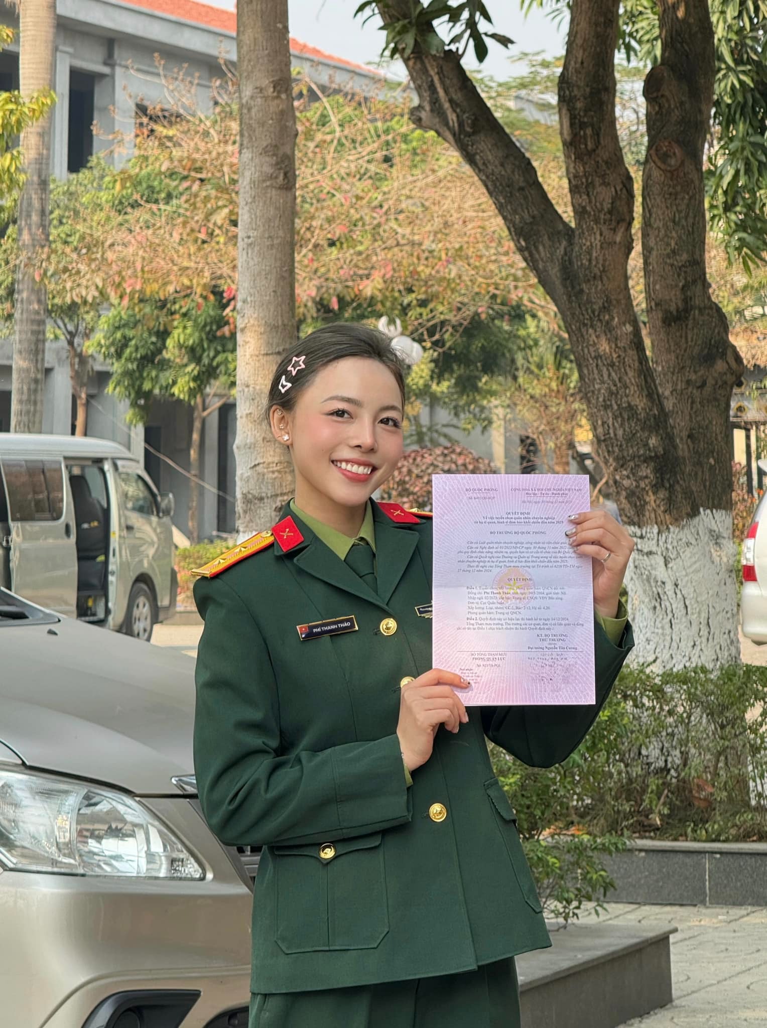 In early 2023, Thanh Thao surprised many by volunteering for military service. She currently holds the rank of First Lieutenant, a professional soldier, and is part of the Army shooting team.