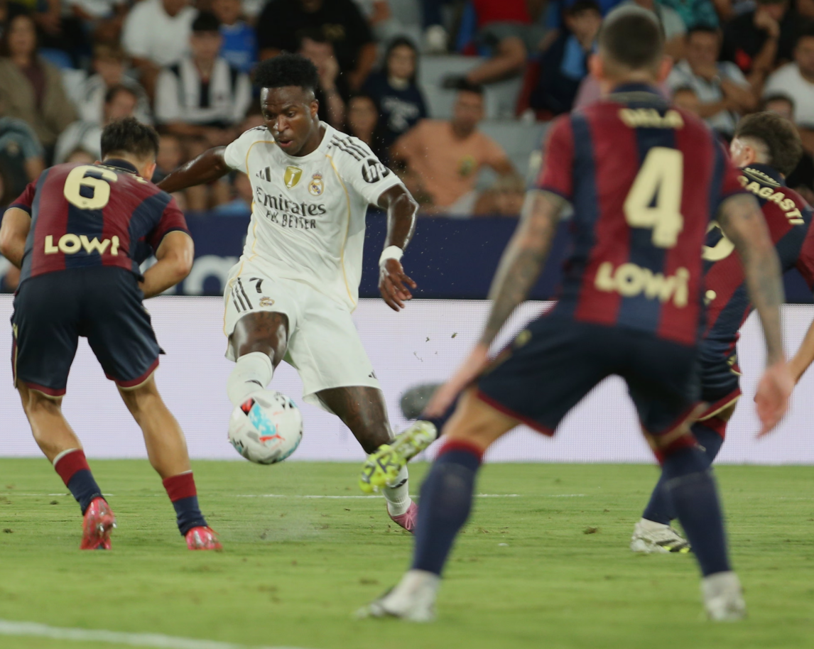 Vinicius curls a shot into the far corner to open the scoring in Real Madrid's 4-1 victory over Levante in the sixth round of La Liga at the Ciutat de Valencia Stadium, Valencia, Spain on 23/9/2025. Photo: AP