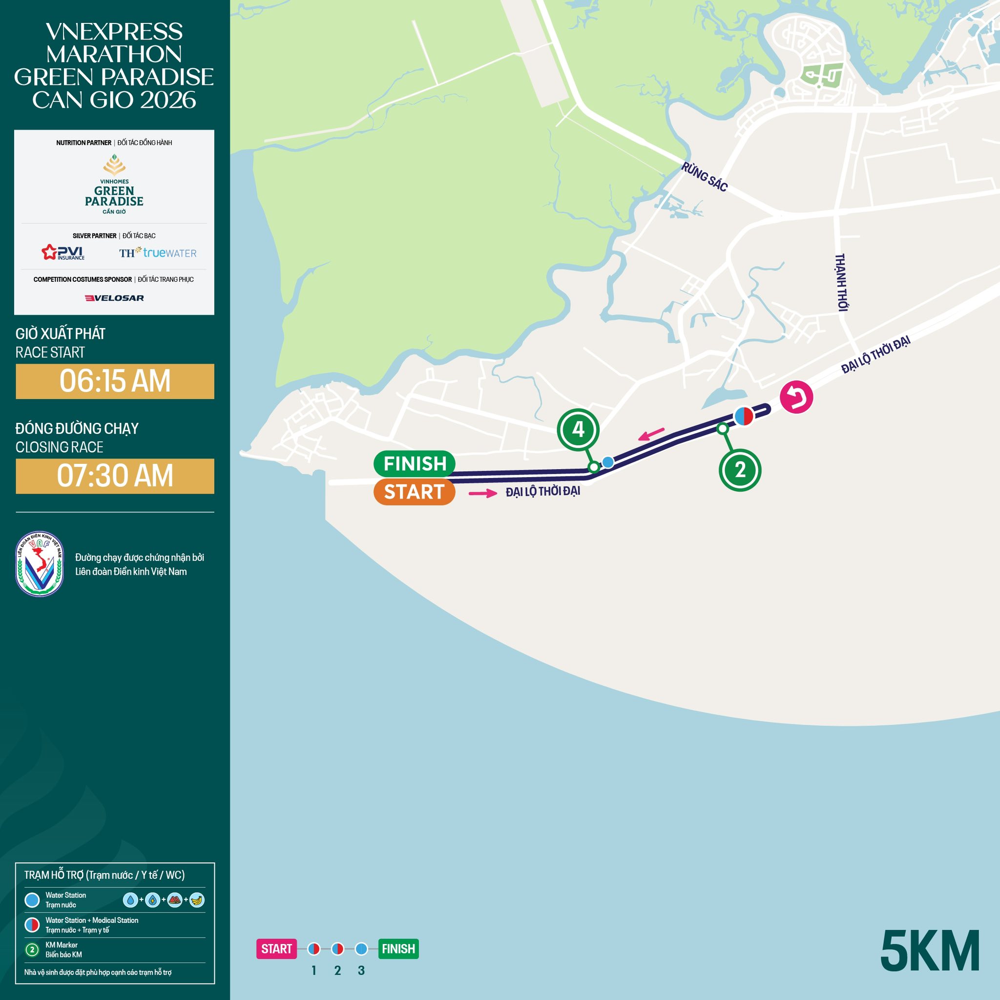 For the shorter distances, the race is designed mainly within the Vinhomes Green Paradise project's internal area. The 5 km distance starts on Dai Lo Thoi Dai, runs straight for 2,5 km, then turns back along the same route to finish at the starting point. The 10 km distance has a similar structure, with a 5 km straight section before turning back into the internal area.