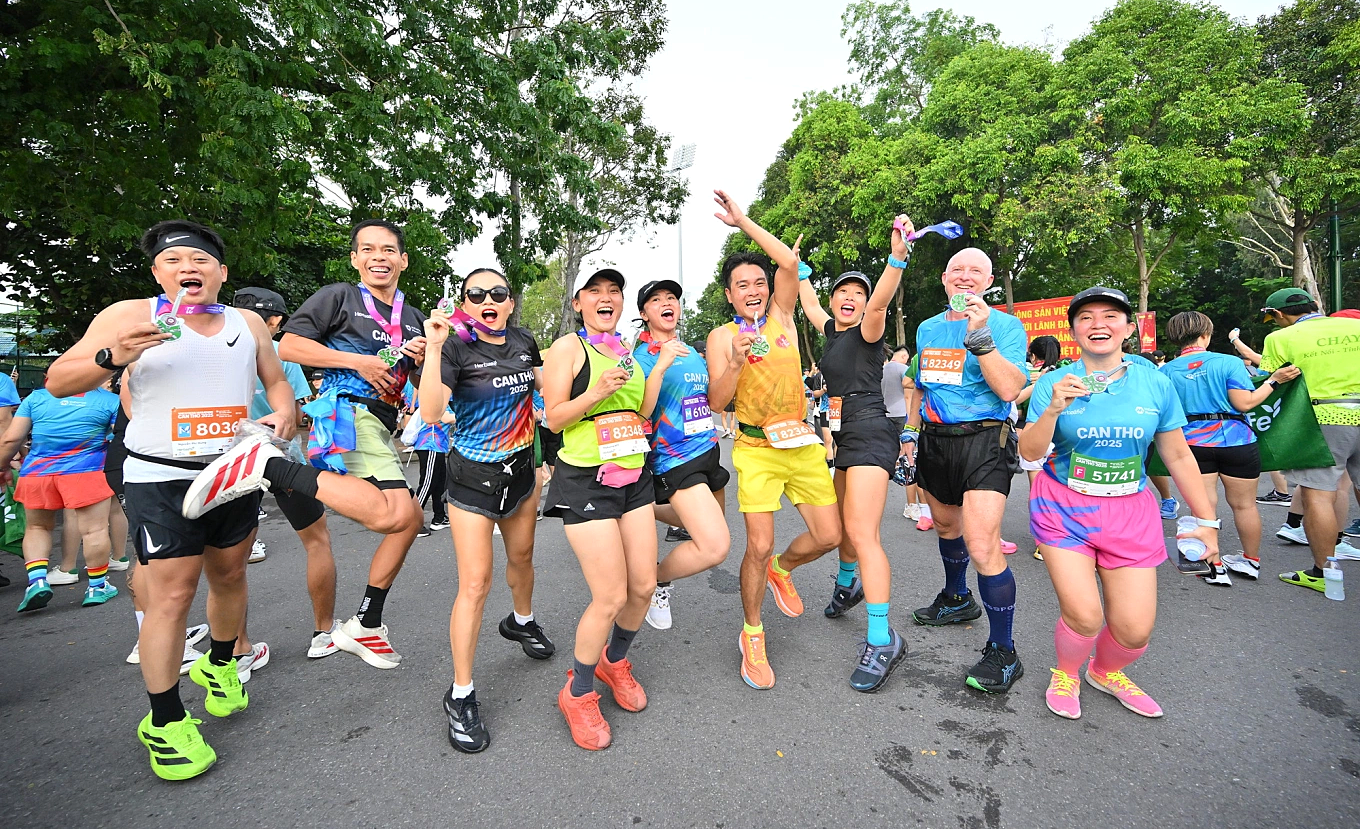A group of runners celebrate after completing the VnExpress marathon Can Tho 2025 course. Photo: VnExpress Marathon |