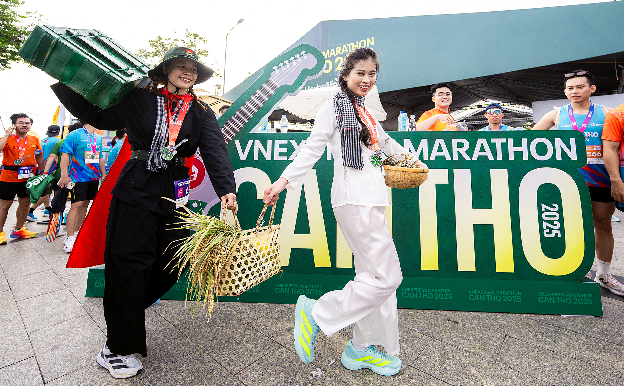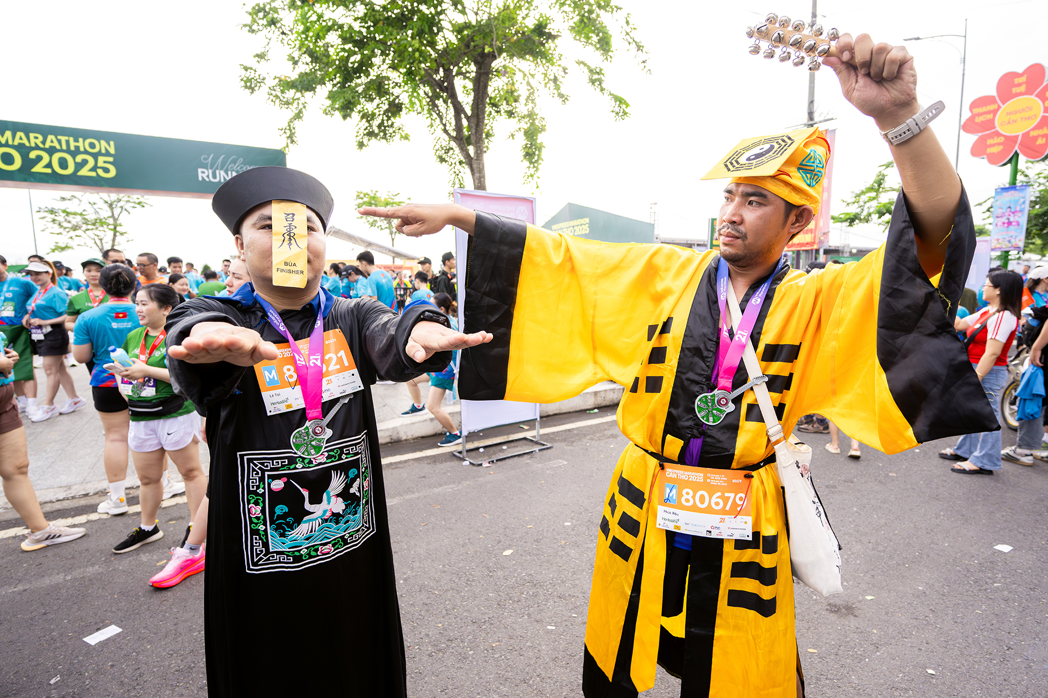 Runners Phuc Rau and Le Tai dressed up as a "Taoist priest and a hopping vampire," two characters often seen in Chinese culture. While talismans are used for exorcism in movies, at the VnExpress Marathon Can Tho, the talisman on runner Le Tai's forehead read "finisher talisman," implying it would help him reach the finish line.