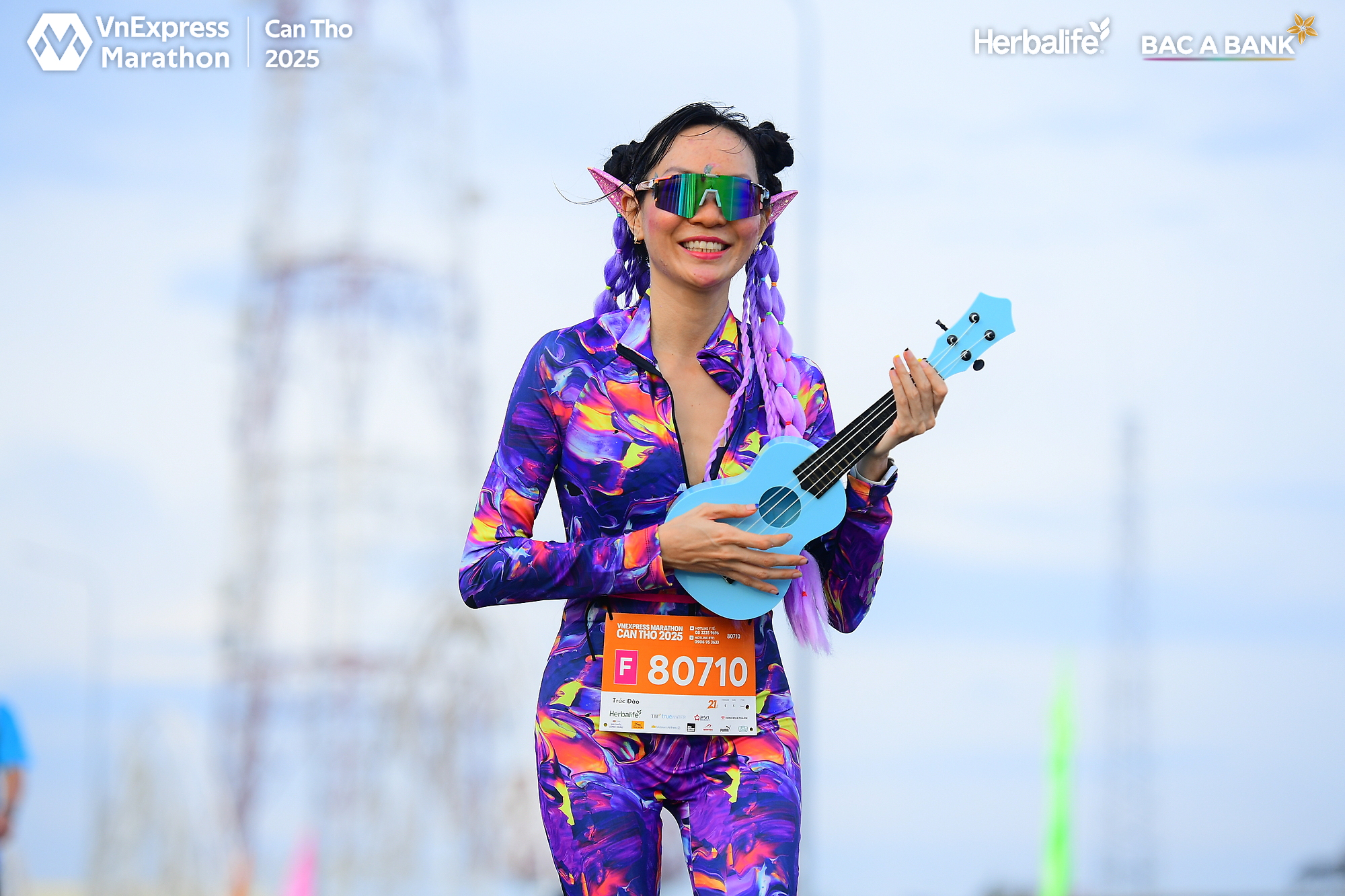 Runner Truc Dao chose a vibrant costume with blue and purple patterns. She wore a wig, carried a ukulele, and donned pointy ears, reminiscent of elves or catwomen in Western culture. She ran the 21 km race.