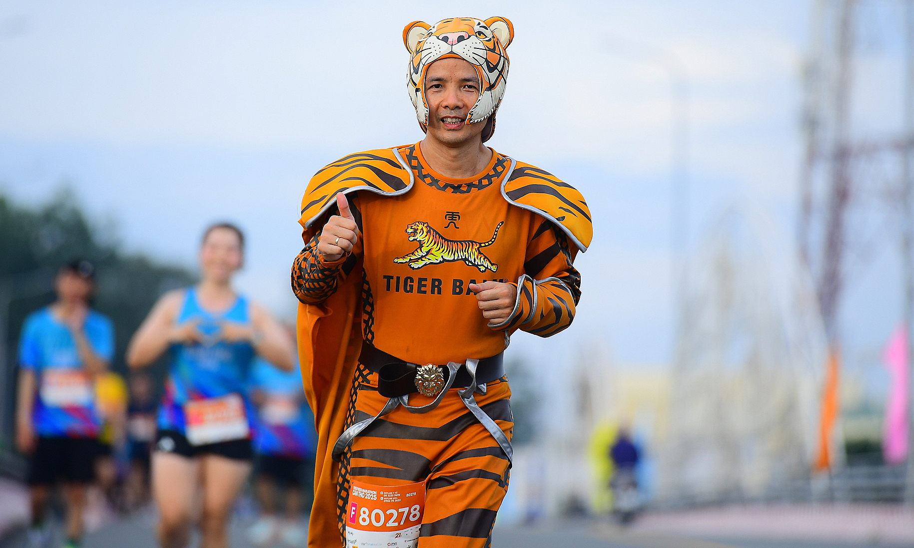 A male runner dressed as a tiger, the mascot of the healthcare brand Tiger Balm. At the VnExpress Marathon Can Tho, Tiger Balm provided care and recovery services at the expo area, helping athletes warm up before the start, relax, and receive muscle-relaxing massages after finishing.
