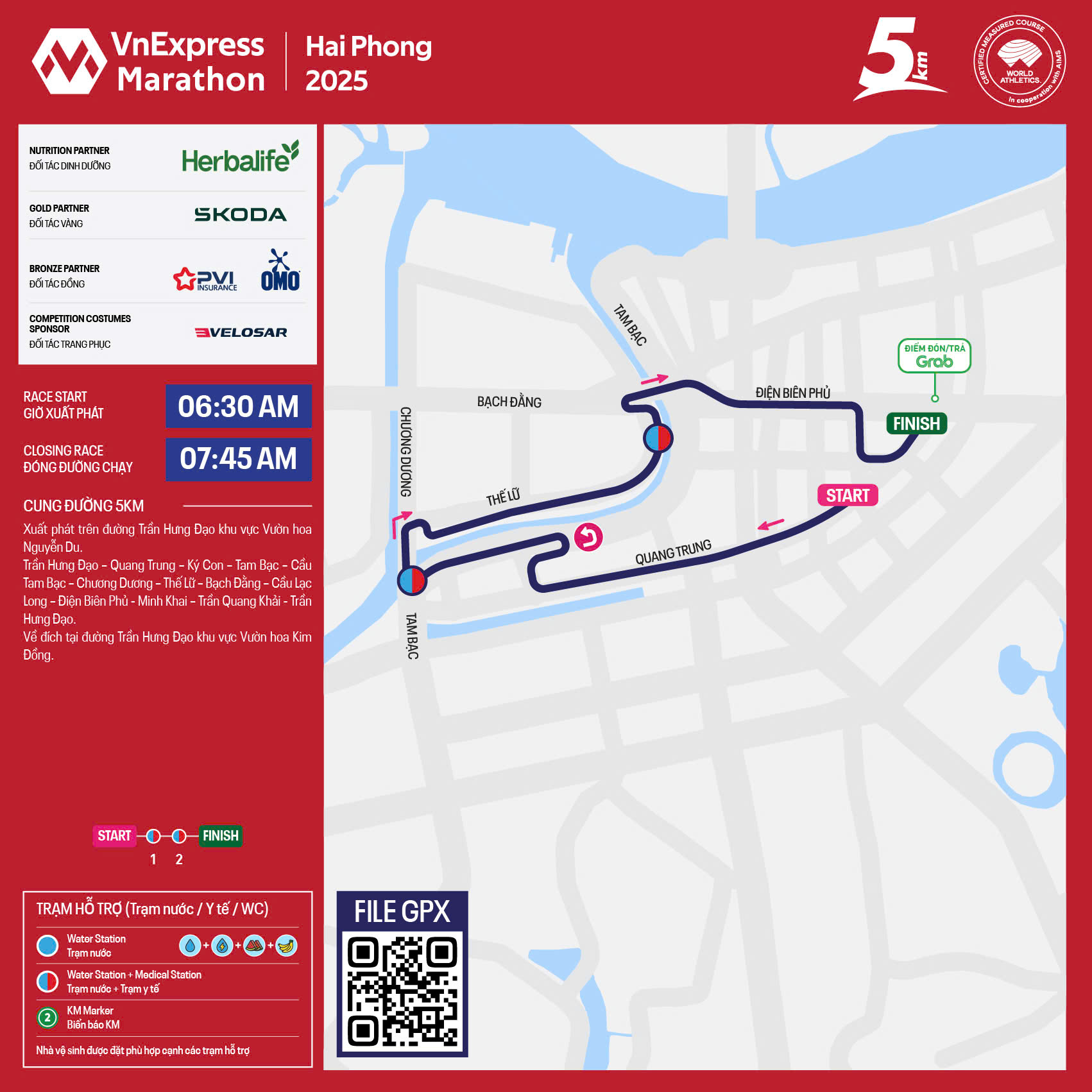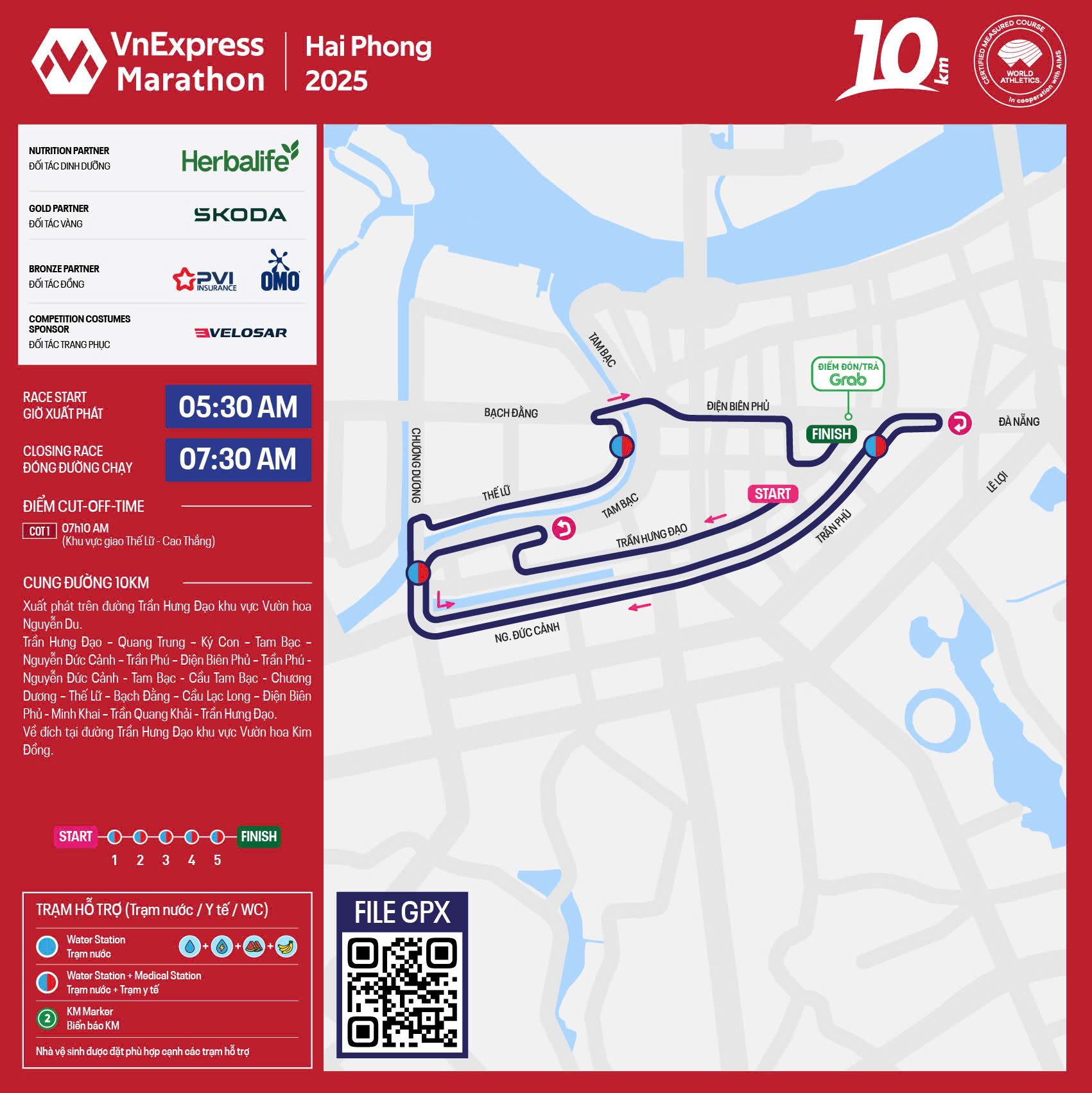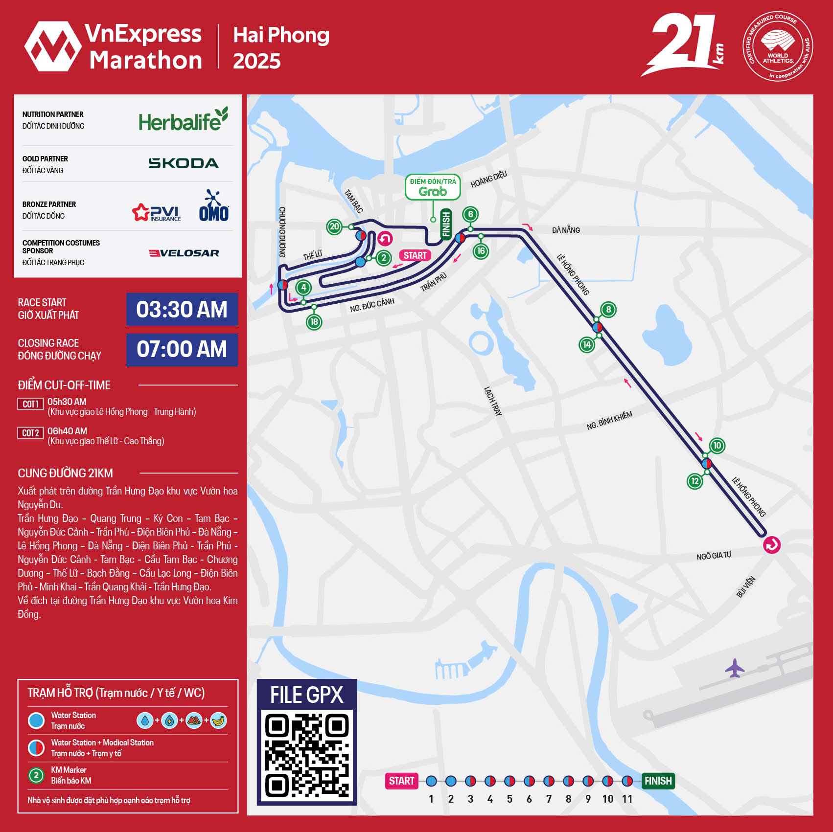 For the 21km distance, runners will start at 3:30 h and must finish before 7 h. The two cut-off points in the Le Hong Phong – Trung Hanh and The Lu – Cao Thang areas remain unchanged from the 2024 season. The 10km distance starts at 5:30 h and closes at 7:30 h, with one cut-off point at the 7:10 h mark. The 5km distance starts at 6:30 h and closes at 7:45 h.