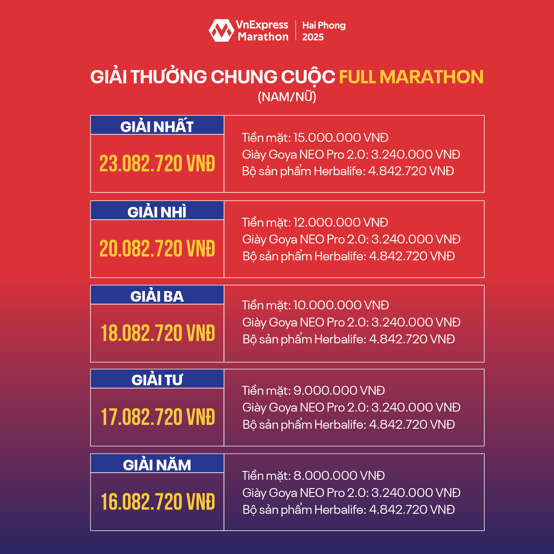 For the full marathon (42km) distance, the male and female champions will each be awarded 15 million VND in cash, a pair of Goya Neo Pro 2.0 running shoes, and a set of nutrition products. The total value for each champion exceeds 23 million VND. Athletes finishing from second to fifth place will receive 12 million, 10 million, 9 million, and 8 million VND in cash respectively, along with gifts from event sponsors.