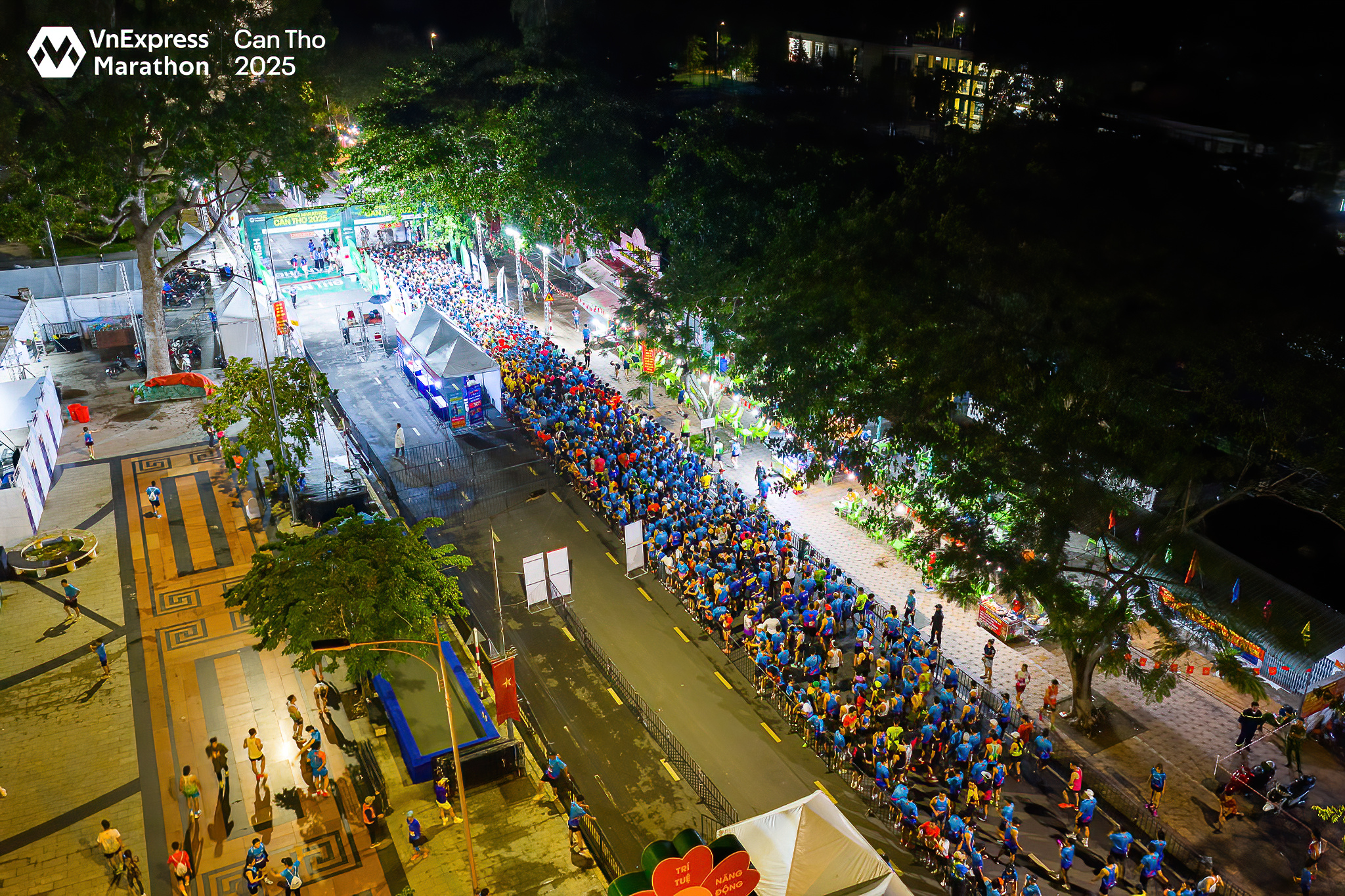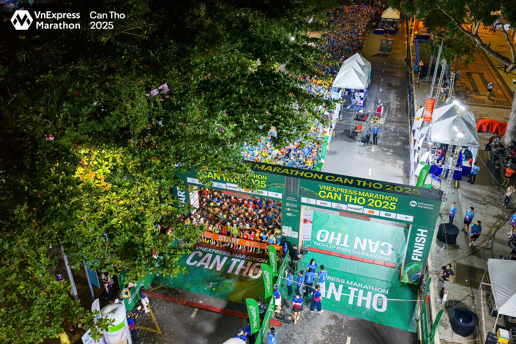 The race began at 2:30 a.m. with the first wave of runners tackling the 42km distance. For its debut in the southwest region, the VnExpress Marathon featured blue running shirts, evoking the Mekong Delta's waterways. Thousands of 21km runners lined up, awaiting the starting signal. |
