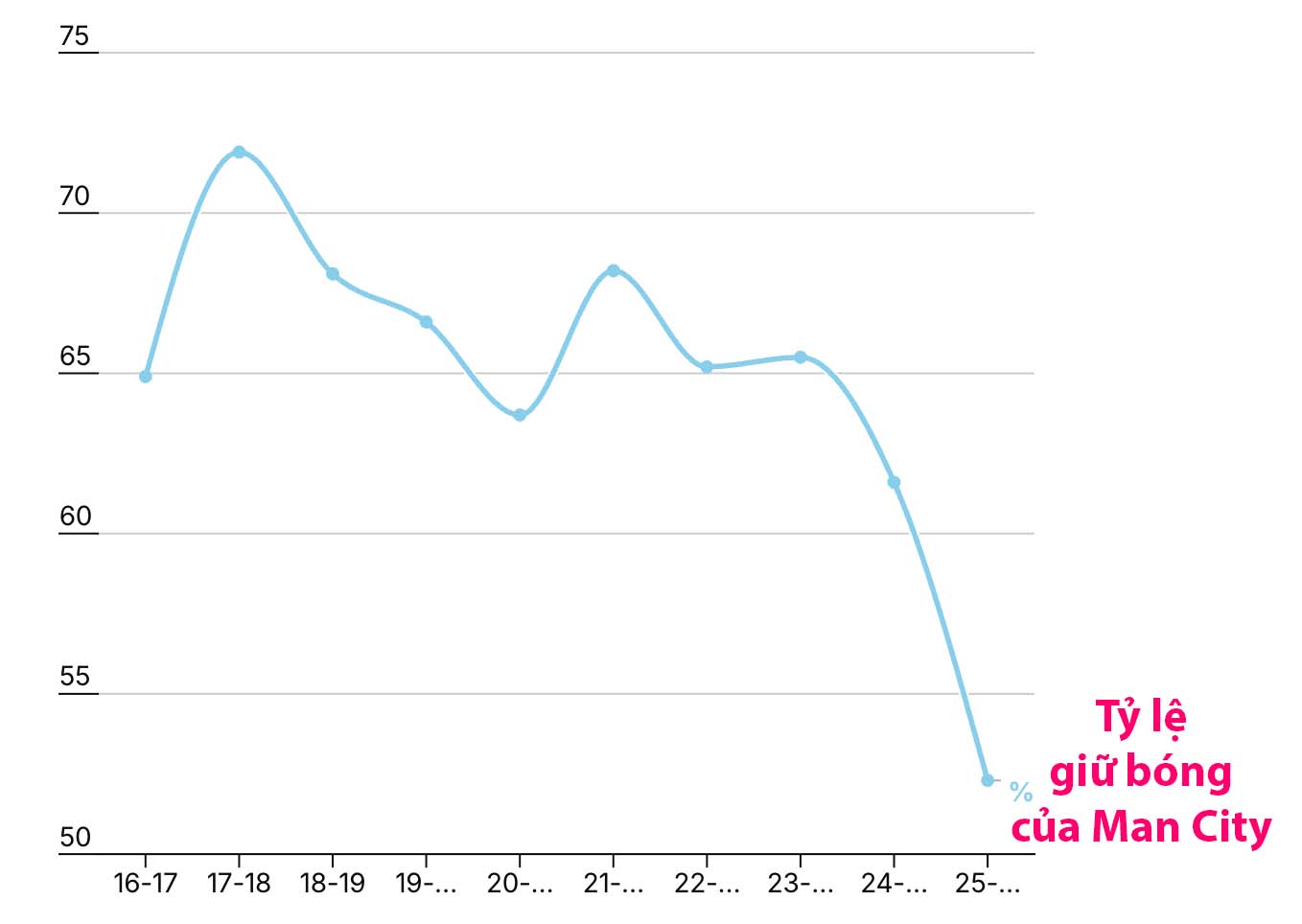 Man City's possession percentage has gradually decreased over the seasons under Guardiola. |