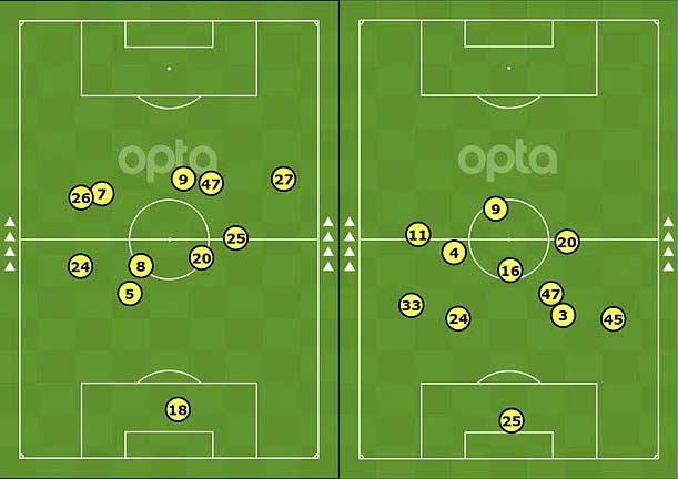 Man City's average player position at the Emirates last season (left) was much higher than this season (right). |